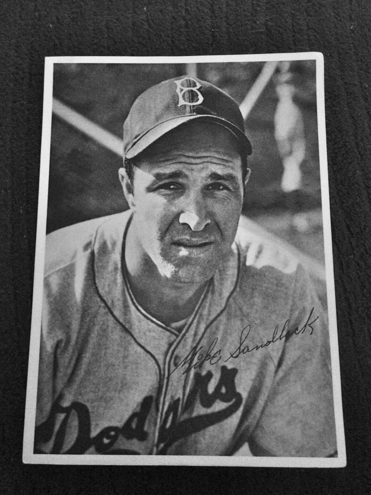 You'll find images of Mike with the three major league teams he played for here. And there's a nifty image of him from the 1954 Phillies yearbook here. The attached image (in need of a perspective fix) is a 1947 team issued postcard of Mike with Brooklyn currently being offered on eBay by seller krout20. |