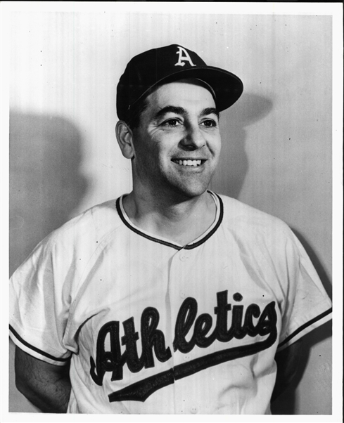 Right. During the regular season the KC A's wore uniforms such as the one worn by Jerry Schypinski on the left. During spring training, however, they wore uniforms similar to the Philadelphia design, as shown in the photo of Lou Boudreau (who was named A's manager in November 1954) on the right.