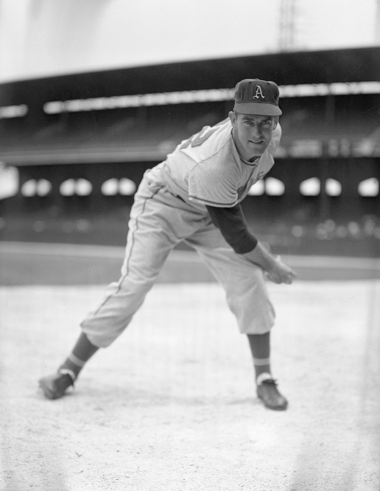 Right. During the regular season the KC A's wore uniforms such as the one worn by Jerry Schypinski on the left. During spring training, however, they wore uniforms similar to the Philadelphia design, as shown in the photo of Lou Boudreau (who was named A's manager in November 1954) on the right.
