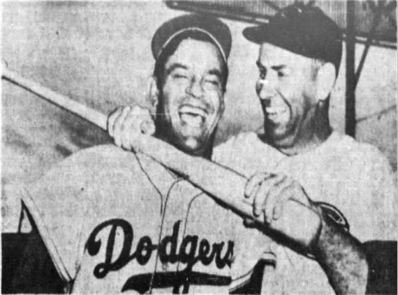Bill Bevens, in the Reds uniform, jokes about taking revenge on Cookie Lavagetto for the latter's breaking up Bevens' 1947 World Series no-hitter with two outs in the ninth. Many of you will remember that Lavagetto's double drove in two runs and gave the Dodgers the 3-2 win over the Yankees in that 4th game of the series.