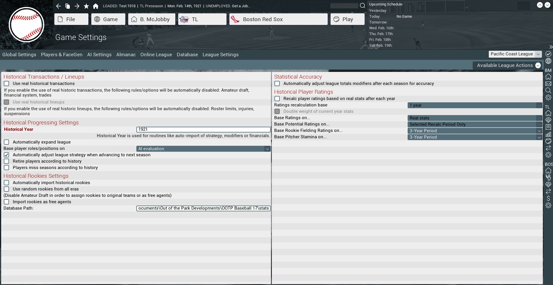 Now, a follow up question for you, Sir Spritze. In the game, I have recalc (3-year FWIW) selected at the major league level. When I look at the league settings for the minor leagues, recalc is not selected automatically. Should I select it there, as well, to have consistent results? What is the effect of selecting or not selecting recalc at the minor league level in historical games? Thanks. (Oh, and by the way, you can only get to the "Historical" settings screen in the minors by being there in the majors, and then changing the league in the drop-down menu on the upper right-hand side. If you go directly into the minor league, no "Historical" tab appears in league settings. That's weird, huh?)