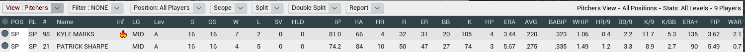 Notes: King and Keeran struggle a little, but still put up respectable numbers for their age. I expect they will both have a full season in the bigs next year. Not a lot of movement form the other guys, mostly Rookie to High A ball. I expect they will all be in AA or higher next season. Playoffs to sim next, then I will run it to Spring 2018. |