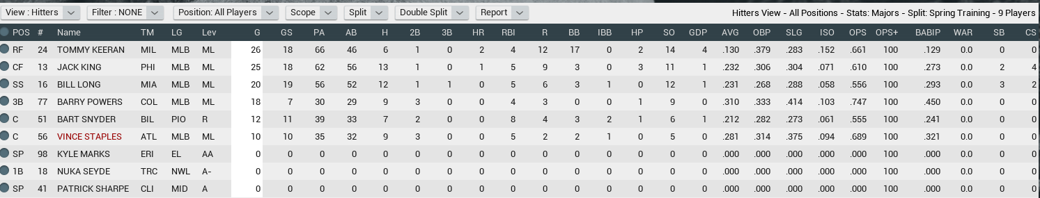 I'll post player pages, stats, spring standings, predictions, and top prospects when the spring is done simming. |