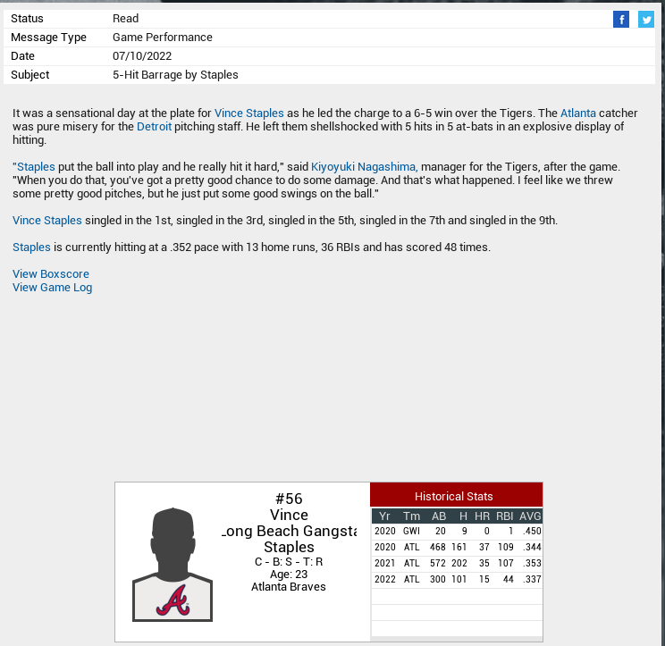 Notes: Staples out 3 weeks with a back injury Snyder goes yak 3 times in one game Powers leading the league in Avg...even tho he has been on the trade block for nearly 2 seasons. |