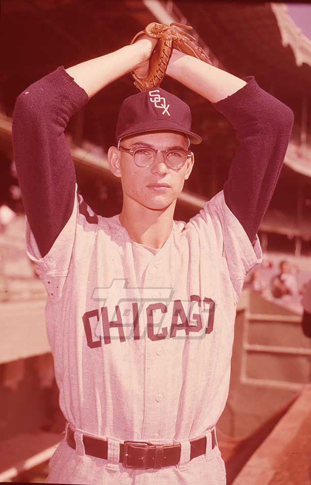 For example, here's Tom McCraw, likely from 1971. (BM 388 and 389) I don't see the 1969 Centennial patch (the Sox wore it on the left sleeve, at least on the road uniforms), so it's more likely a 1970 uniform, and with the "last year's laundry in the spring" tradition, that makes this 1971. Tom was a Senator that year, but he wasn't traded until the end of camp (March 29), so there was plenty of time for Topps to shoot him. I also have a few 1971 spring shots from other sources: Bill Melton Carlos May And it appears that Topps might have had a stringer wandering around Sarasota in the spring of 1969, after all, as this shot of Joel Horlen (pp294) catches him in the 1968 kit (note the Illinois sesquicentennial patch on the sleeve). Which makes it OT for the discussion of the pinstripe-free Don Gutteridge-era uniforms, but it's still interesting to see a shot from that era, for reasons discussed above. |