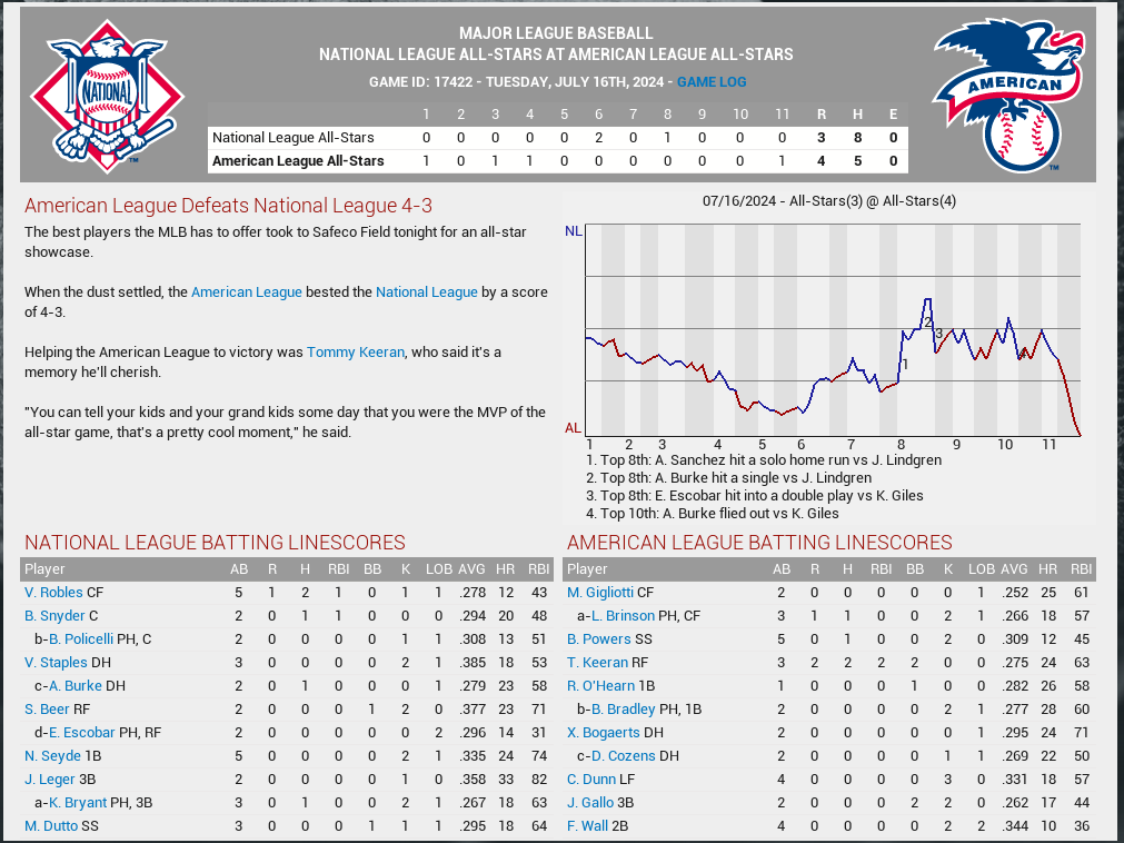 Notes: Staples dinged up, but still putting up numbers. Snyder has hit streak broken at 21. Marks get a POM...looks like Sharpe and Marks are going to go every other year with a CY. The pitchers look like they have finally learned all their skills, man the learning curve for pitcher development is a lot longer than hitters in this ootp version it seems. |