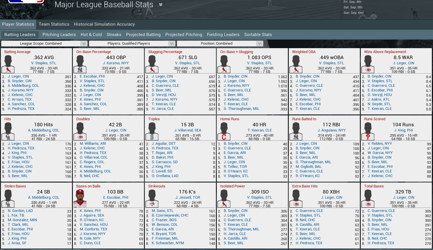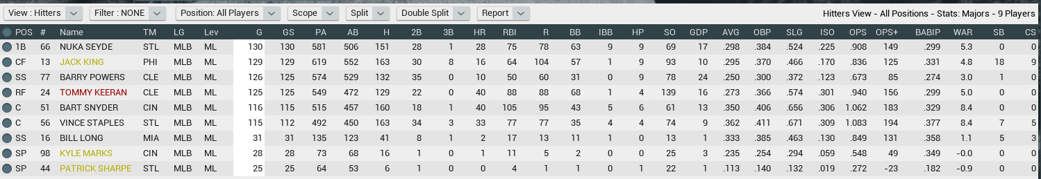 Notes: Keeran comes back, but suffers intercostal strain and goes down for the regular season. His milestones will have to wait till 27 Staples wins NL batting crown King makes headlines and has a rock solid year Philly fades though and is out of the playoffs Cincy cruises in The Cards get in wildcard Cleveland grabs a wildcard as well |