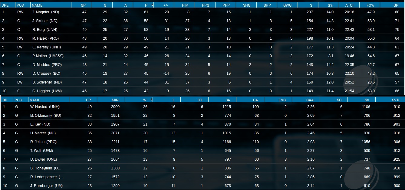 Quarterfinals New Hampshire v Boston College Game 1--UNH 3 BC 2 Game 2--UNH 6 BC 1 Game 3--BC 5 UNH 3 Game 4--UNH 2 BC 1 Game 5--BC 2 UNH 1 (OT) Game 6--UNH 5 BC 1 UNH wins Series, 4-2 (1) Notre Dame def. (8) Umass-Lowell 4 Games to 3 (2) Massachusetts def. (7) Providence 4 Games to 2 (5) Vermont def. (4) Northeastern 4 Games to 2 Semifinals (3) New Hampshire v. (2) Massachusetts Game 1--UMass 4 UNH 1 Game 2--UMass 5 UNH 4 Game 3--UMass 4 UNH 3 Game 4--UMass 3 UNH 2 Massachusetts wins Series, 4-0 (1) Notre Dame def. (5) Vermont 4 Games to 1 Championship (1) Notre Dame v (2) Massachusetts Game 1--Notre Dame 4 UMass 1 Game 2--Notre Dame 4 UMass 2 Game 3--UMass 6 Notre Dame 3 Game 4--UMass 2 Notre Dame 1 (OT) Game 5--UMass 3 Notre Dame 1 Game 6--UMass 3 Notre Dame 2 (OT) Massachusetts wins Series, 4-2 The Massachusetts Minutemen win the inaugural HEPHL Championship! UMass C Pepe Molina is named playoff MVP, going 7-12-19 and was a +17 in 16 games. 2016 Award Winners As I mentioned in the initial post, covering why I chose Reed Berg with the #1 pick of the draft, he could win the scoring title (he did) as well as being the best defensive forward in the league (he was). Berg cleaned up, winning MVP, Defensive Forward of the year, +/- Leader, leading goal scorer, and the overall points leader. I'd say he earned that #1 pick. That being said, the other player I was considering taking with that pick, Jakub Honek, took home the "Newcomer of the Year" award, whatever that means in the inaugural season of a league, scoring 25 goals and adding 39 assists in 74 games. MVP--Reed Berg (UNH) 46g 51a 97 Points +46 Goalie of the Year--Wilbur Husted (UNH) 47-25-6 2.12 GAA .914 Sv% Defenseman of the Year --Lubomir Janosek (UMass) 15g 44a 59 Points +39 Defensive Forward of the Year--Reed Berg (UNH) |