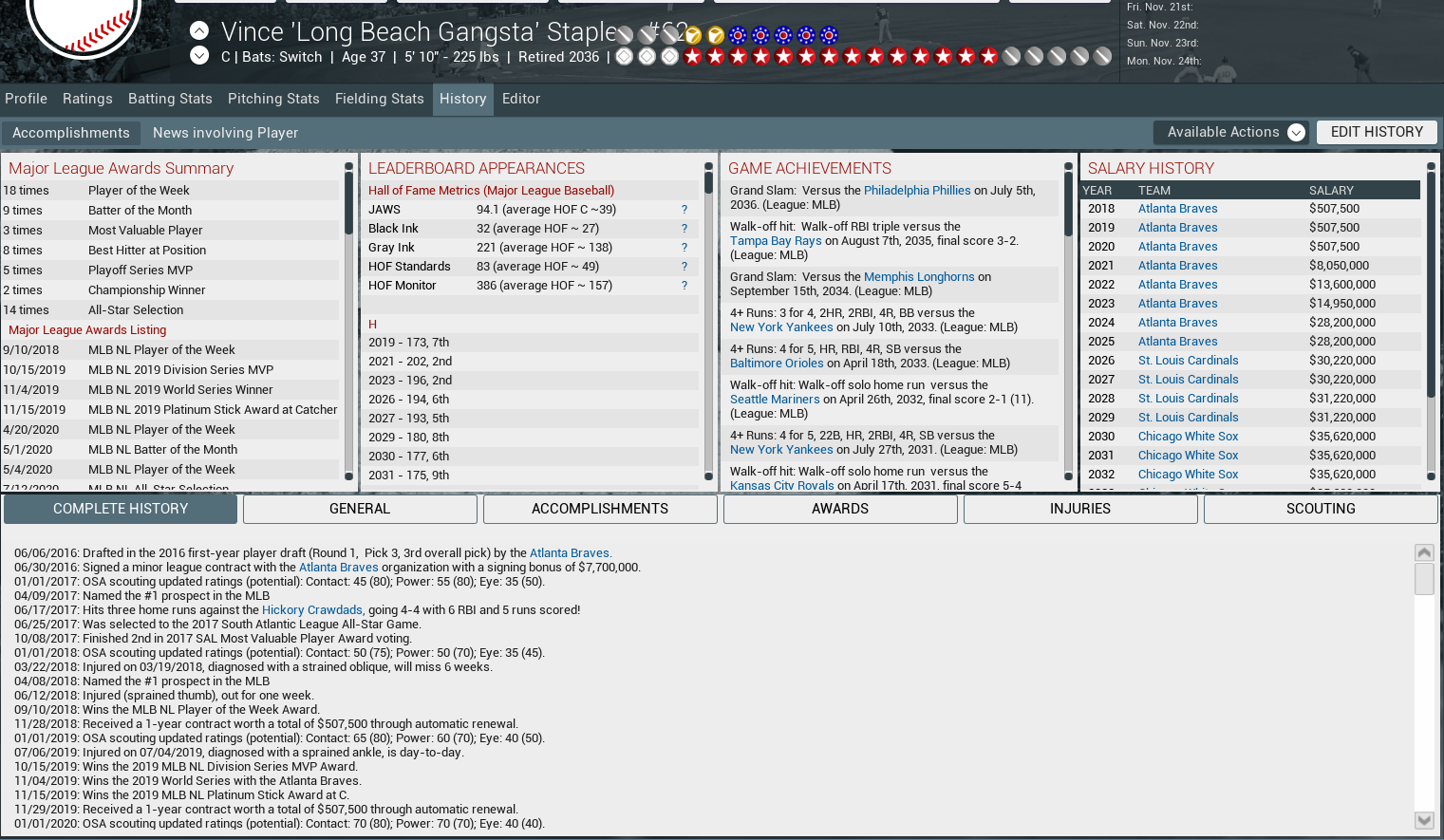 Vince retires with 521HR, 1581 RBI, a.322AVG, and 125.4 WAR He ranks 24th in HR, 48th in RBI, 42 in AVG, and 10th in WAR. Vince was a 3 time MVP, a 5 time playoff MVP, a 2 time championship winner, and a 14 time allstar |