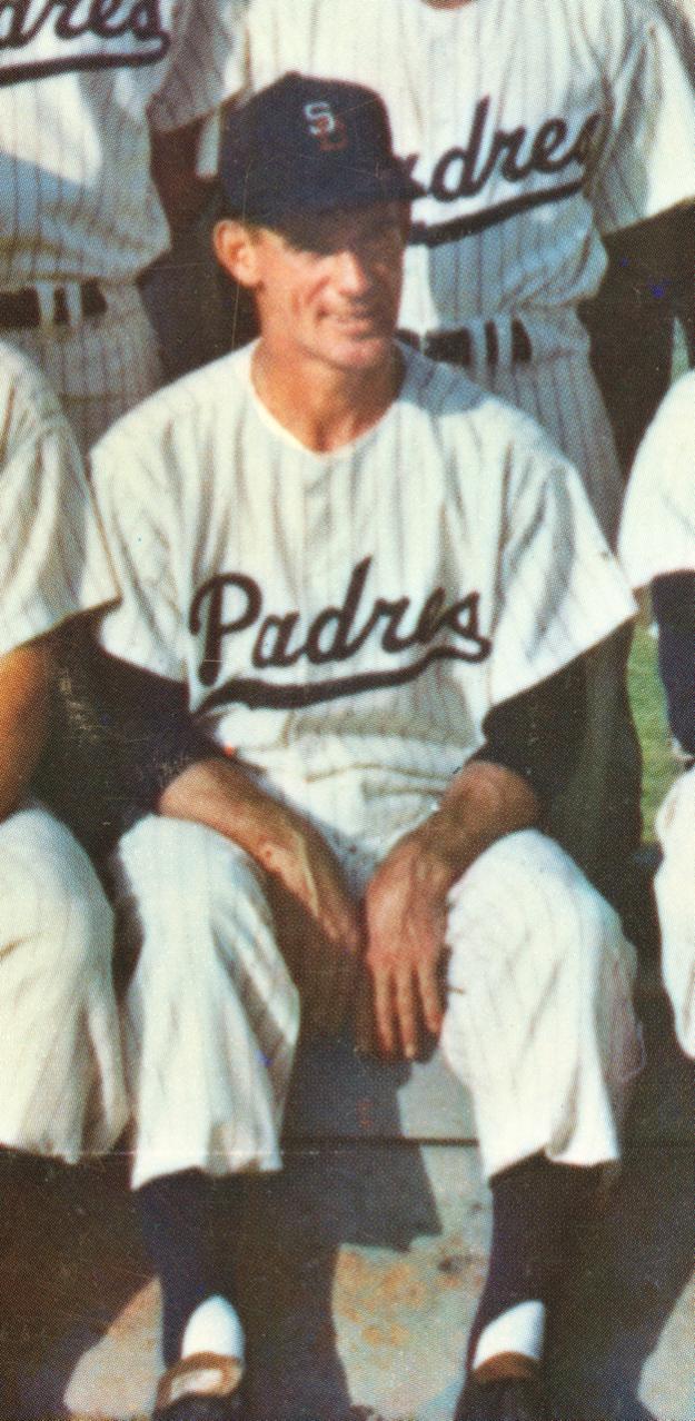For a guy who had only two cups of coffee, with the '55 Phillies and '57 Cards, I've read a lot of hand-wringing over the years about photos of Lovenguth. To be fair, no color image of him has ever appeared. Yet, for whatever it's worth, here he is at literally the last stop in his pro career, in the color team photo of the 1961 PCL Padres. |