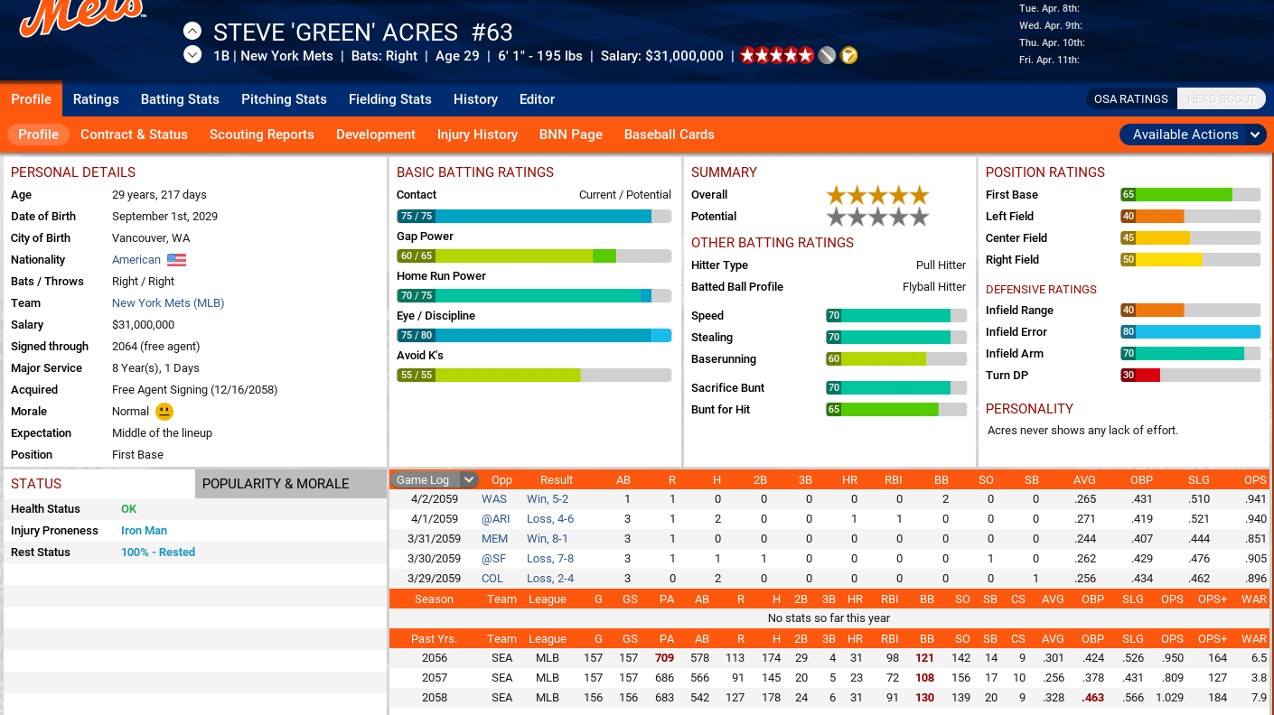 I have no idea why, but the game didn't create a news story when Acres signed...so without further ado...the rich get richer and NYM signs Acres to play 1b fir 6yrs 186mil, for 31 per and a player opt out after 2061.