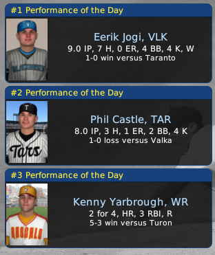 Monday, September 28, 2054 Ruthlandian Union Division Championship Series - Game 5 ROOSTERS RALLY LATE, STAY ALIVE IN 5 Middlefield was in dire straits after six innings in game five of the Ruthlandian Division Championship Series on the road at Granger Field in Wynnamac... they were down 3-1 in the series and they were down 3-1 in the game with Simon Northcott cruising along in control, but the Roosters snapped out of their slumber and tied the score 3-3 in the seventh on a clutch two-run double by 2B Rupert Forbest (.273/3 RBI)... then they really went to town in the next frame, tallying three runs off losing hurler Dion Delgiorno (0-1/5.40)... LF Trip Agarn (.227/2 RBI) put the go-ahead run on the scoreboard with a sac fly and 3B Kenny Jenkins (.308/4 RBI) delivered the coup de grace, a two-run homer... however, the Sundowners didn't give up... they loaded the bases in the ninth with only one out, but Ricky Farris doled out a double-play ball to end the game... Middlefield pulled it out 6-4 and remained alive in the best-of-seven series, but the are still down three games to two to Wynnamac... the Sundowners pretty much dominated the game with 14 hits to just seven for the Roosters, but they left 12 runners on base... starter Hollis Dale (1-1/7.59) got credit for the win, despite giving up 11 hits and four runs in seven innings... the teams will now head back to Middlefield for the rest of the series. VALKA AHEAD OF TARS AFTER 5 Not many people gave much respect to the Valka Blackhawks in the Pro Cup playoffs... they would soon be one and done in the postseason... but that's not how it is playing out thus far... the Blackhawks just won their third in a row from Taranto and they now have a three games to two edge in the best-of-seven Ruthlandian DCS... Valka polished off the Tars 6-3 in game five with solid pitching... Adrian Stenhouse (1-1/3.95) wasn't great but he was adequate... he tossed six and two-thirds innings, leaving with a 4-3 edge... Blackhawk closer Ricky Cockburn followed him and sealed the verdict with two and one-third innings of scoreless ball... Armani Pizziconi (1-1/1.80) caught the loss, allowing four runs in his six frames... Taranto totaled 10 hits to seven for Valka... six different Blackhawks drove in runs with 3B Corey Belk (.500/4 RBI) leading the attack with three hits... and RF Mel Shadwell (.200) homered for Valka... Taranto's 2B Rico Messina (.412), CF Renzo (.182) and LF Kuma Toyota (.350) collected two hits each... underdog Valka will have to win the series on the road at the Palazzo di Sport in Taranto... the feisty Blackhawks need one win there... the Tars have to take both contests to survive and advance to the Ruthlandian title series. Tycobbian Union Division Championship Series - Game 5 TURON TOPS RASCALS IN 5 GAMES In the Tycobbian Union Division Championship Series Turon topped White River much easier than expected... the Typhoons trounced the Rascals 7-1 and won the series in just five games... White River's noted mound staff just didn't get the job done... but the Turon twirlers did... in a route-going performance Yancey Hedges (2-0/2.70) won for the second time, stopping the Rascals on just seven hits, struck out eight batters and walked just one... the Typhoons were sparked at the plate by 1B Shoyo Yuro (.533/4 RBI) with three hits, three runs and two RBIs... Yuro hit a two-run roundtripper in the seventh and put the game out of reach... 21-game winner Nicky Palmer (0-2) floundered for the second time in the series as Turon torched him for six runs in six-plus innings... Turon was the third choice to win the Pro Cup this year, White River was selected sixth in the Pro Cup poll... the powerful Typhoons now head to the Tycobbian title series against the victor of the Midway-Arlon series. Turon skipper C. C. Kingsford was elated with his club's first-round performance... "We not only pitched well, but we did a great job at the plate against one of the better pitching corps in the IPA... even in a seven-game series I never expected to score 38 runs... and we scored that much in five games." Marty Blake, the White River manager, said his club's only chance was its fine pitching staff... "Turon tore us up... on the mound and at the plate... totally beating us in four of the games... they never gave us a chance.". Turon outscored White River 38-13 in the series, outhitting the Rascals .269 to .213, outhomering them 9 to 5 and outpitching them with a 2.45 ERA to 5.65. MIDWAY KO'S ARLON IN 5-GAME SERIES In the fifth and deciding game of a best-of-seven affair, the mighty Midway Wolves, the current reigning king of the IPA and favorite to win back-to-back Pro Cups, had to pull out all stops to get by the plucky Arlon Champs 9-8 in a high-scoring scorcher... Midway KO'ed Arlon in five games to advance to the Tycobbian Union Championship Series, but each and every one of them was a fight to the finish... in the elimination game Arlon went down swinging and almost came away the victor, scoring three runs in the last of the ninth... they had the tying and winning runs on base with only one away when closer Jeff Leonard finally put away the Champions for the season, retiring two of Arlon top sluggers, LF P. J. Flagg and CF Rebel Bryce... after four low-scoring affairs Midway finally broke loose and put some runs on the scoreboard, walloping 18 hits with SS Kax Clark (.500/4 RBI), 1B Tim Merritt (.111/7 RBI), CF Ernesto Diaz (.211/3 RBI) and pitcher Yank Atchley (.750/2 RBI) batting in a pair of runs apiece... Arlon piled up 11 hits, led by SS Campy Campanella (.200/3 RBI) with a three-run homer and 1B Darlon Danford (.333/3 RBI) with a three-run double... each and every game was a tense duel with four of the five games decided by a single run... the fifth was a two-run decision... Midway won four games to one, but they certainly knew that they were in a series... Arlon gave them quite a tussle. Victorious manager Bobby Dorignac sighed a breath of relief to 