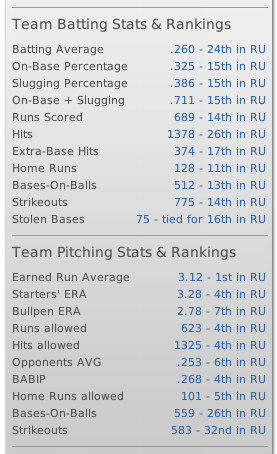 FAR MOUNTAIN REDHAWKS Owner: Becker Hospitality Enterprises GM/Manager: Robby Kelly Far Mountain, located in northern Ruthlandia in the Appian Mountains, is a very popular year-round ski resort and convention center. A beautiful town of 75,000 founded by immigrants from the German and Swiss Alps, Far Mountain oozes Tyrolian charm and culture. Horse drawn sleighs and buggies provide free public transportation. The rich and famous come here for wonderful ski vacations, to savor the good life and to enjoy the great hotels, nightclubs, shops, restaurants and nightlife. Yet it is priced for every pocketbook. Middle class families also partake of its many pleasures and activities. And with fine convention facilities, Far Mountain plays host to many professional and educational organizations. And it is the home of the Far Mountain Redhawks baseball team of the Ruthlandian Union. The team is in the North Division and plays their games at Sky High Stadium with a magnificent panoramic view of the Appian Mountains in the distance. A specialty at all Redhawks games is a great polka band that furnishes music and songs, whenever there is a break in the game action. During the seventh-inning stretch Redhawks supporters have a great time doing the “Chicken Dance” and singing “Take me out to the ballgame” to the accompaniment of the polka band. And fans get to enjoy special culinary treats of Bavarian beers, Nurnberg bratwurst mit sauerkraut (fried sausage with sauerkraut), Schwartzwalder kirschtorte (Black Forest cake) and Apfelstrudel (apple strudel) pastries and hot gourmet soups at the games. Many fine German beers are served in profusion, too. In addition all of the traditional ballpark favorites are provided. The Far Mountain Redhawks have been owned by Becker Hospitality Enterprises for 150 years. They are the proud proprietors of one of the oldest hotels in town, The Bavarian Gasthaus. Johan Becker developed a love for baseball in high school and college and played varsity baseball for both. He met Jock Ewing of Ewing Oil and Ewing Enterprises and developed a business relationship with him to make Far Mountain into a tourist resort. When Ewing offered him one of the franchises in the IPA, Johan quickly invested in it... his family is still running the business. Far Mountain has had only three managers in its history. For a general manager and field manager, Becker originally hired one of the great pitchers of the industrial leagues, Alex Groveland, who was the architect of the famous Far Mountain three-peat, the winning of three straight Pro Cups in 2011, 2012 and 2013. It's been accomplished only one time in the annals of the Islandian Pro Alliance. Grove made the playoffs 10 times in his managerial tenure. The second skipper was one of the best players in IPA history, Hall-of-Fame shortstop Don Nichols. As a player Nichols sparked Far Mountain to the three consecutive Pro Cup titles and seven division flags. In his 24 years in the league Nichols batted .310 in 3523 games (8th) with 3760 hits (5rd), 1773 RBIs (16th), 2161 runs (4th) and stole 668 bases (8th). In 95 playoff games he hit .300 with 9 homers, 51 RBIs, 53 runs and 17 stolen bases. Nichols was elected to the IPA Hall of Fame in 2027. He played 17 years with Far Mountain and 7 with the Marston Nine. He retired as a player in 2024. When Nichols retired, he was replaced by his pitching coach, Robby Kelly, who was a teammate of Nichols during the glory years and also an IPA Hall-of-Famer. Kelly was inducted into the Hall of Fame in 2030 after a splendid 19-year career... the chubby 250-pound right-hander posted a 279-196 record with a fine lifetime 3.23 ERA... Kelly holds the all-time Far Mountain record for wins. He played a prime role in the Redhawks' three IPA titles with a fine 11-4 mark in the playoffs those years. In a magnificent year Kelly went 22-8 in 2012 with a 2.38 ERA and was named the Ruthlandian Union Golden Arm and Most Valuable Player. Kelly's final season as a player was in 2019. Sky High Stadium (1997) Capacity: 10,444 Dimensions: LF Line 330 LF 354 LC 380 CF 402 RC 380 RF 354 RF Line 330 Last edited by Eugene Church; 12-16-2017 at 01:39 AM. |