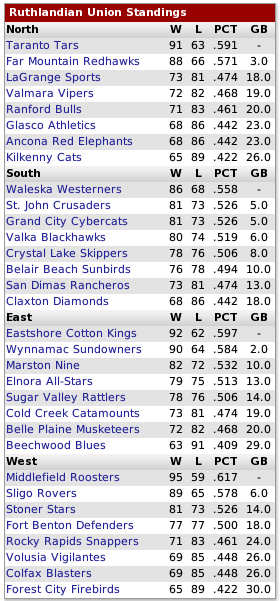 Wednesday, September 20, 2056 WALESKA GRINDS IT OUT IN RU SOUTH The Ruthlandian South is one of the lesser divisions in the Islandian Pro Alliance, but it was a good race for the fans... seven of the clubs were near the top of the standings at the All-Star break... and it was still up for grabs at midseason... the gritty Waleska Westerners just hung in the hunt and wound up the winner by 5 games over second place the Grand City Cybercats (81-73) and the St. John Crusaders (81-73)... Valka (80-74) came in fourth trailing by 6 games... last year's winner, Grand City, was favored to repeat in the preseason poll this year. Last edited by Eugene Church; 02-08-2018 at 10:53 PM. |