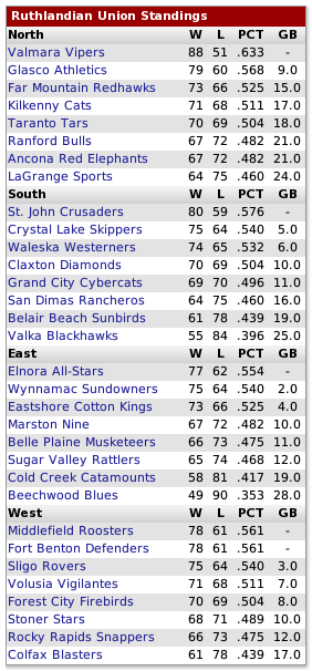 Monday, September 10, 2057 Ruthlandian South Division Waleska's Ethan Addy fired a four-hitter to shipwreck the Crystal Lake Skippers (82-66), costing them a chance to draw within a game of first place St. John (84-64) in the Ruthlandian South Division... Crystal Lake potent attack had no chance against the 22-year-old rookie... 18-year-old rookie hurler David Plant suffered the defeat... Javon Grammer led Waleska with a three-run double in the seventh frame... even though their chances are slimmer than slim, the Westerners (78-70) stayed in the pennant hunt with the victory. Last edited by Eugene Church; 05-13-2018 at 10:35 PM. |