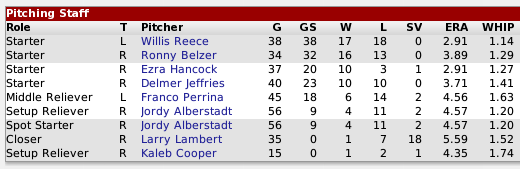 Last Year: (79-75) (17.5 GB) (4th Place) Two Years Ago: (79-75) (20 GB) (4th Place) Last Postseason: 2048 (3 Pro Cups - 2029, 2031, 2048) (11 Pennants) IPA Hall-of-Famer Billy Christianson (.302 BA/248 HR/1446 RBI/1735 R) has managed the Reds since '52... as a Gold Glove infielder he led them to two Pro Cup titles in the 30s and lately has them on track for success in the Tycobbian West... his club came within 3 runs of the division crown this season, losing a heartbreaker to champ Denton City in a one-game playoff... Rolling Hills is a strong team with a heck of a lot of hitting and scoring, adequate power, some fine pitching and top-notch fielding... the future is bright for Christianson and his Reds... rose from fourth place the past two years to a very close second this season. Team Stats: .283 BA (1st), 762 runs (4th), 3.53 ERA (6th), .980 FA (excellent) Top Players: solid pitching rotation with P. J. Dunham, Vince Dillaway, Tommy Otis and the injured Rob Gates (19-9/3.30 ERA)... just might be the best group of starters in the entire IPA... should have had all 20-game winners... the bullpen is solid, too, anchored by Matty Mosby... terrific All-Star rookie first baseman Teddy Stonich had a marvelous year with 36 homers and 121 RBIs and led the club with plenty of help from veteran star Dustin Thibodeau, Jean-Luc Roubique, Jameson Mulbert, Rory Teed, Mike Josephson and rookie Lee Fountain. |