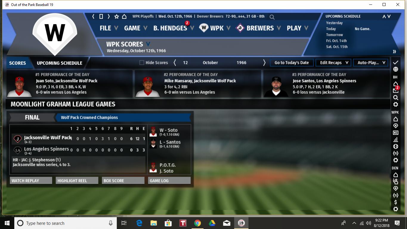 Los Angeles steals a win in Jacksonville in extras in Game 3 of the 1966 World Series. Spinners shortstop Phillip "Seymour" Hoffman (okay, that's not really his nickname, but that's what I always call him and I keep meaning to go in and edit his profile) starts the game with a first inning lead-off homerun and hits another one in the top of the 10th inning which proves to be the game-winner. Former Brewer Mark Compton hit another big 3-run HR to tie the game in the 8th inning.