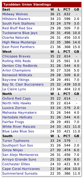 Thursday, August 1, 2058 TU RACES TIGHT, RU HAS BREATHING ROOM After 4 months of play in the Islandian Pro Alliance, the pennant races are still tight in the Tycobbian Union, but the Ruthlandian Union leaders have gotten some breathing room... Wynnamac (69-42) and Volusia (76-35) have forged 10-game bulges in the RU East and RU West, while Crystal Lake (64-47) is 4 games up in the RU South over second place St. John (60-51) and in the RU North, Valmara (72-39) has a 6-game margin over Taranto (66-49)... over in the Tycobbian Union the leaders are bunched tightly... in the TU North, Luxora (64-47) has a 1-game edge on runners-up Oxford (63-48) and North Hills (63-48)... Midway (66-45) is now only 1 game ahead of Pro Cup champion Red Bluff (65-46) in the TU East... Arlon (66-45) has taken over the lead in the TU West... the Champions are 2 games ahead of Chicopee (64-47) and 7 games better than Rolling Hills (59-52)... in the TU South, the Southport Sun Sox (66-45) top second place Turon (63-48) by 3 games. Ruthlandian Union The Valmara Vipers continued to roll in the Ruthlandian North Division with a 19-9 mark in July... the runner-up Taranto Tars lost ground with a 15-13 record and fell 6 games out in the division race... third place Far Mountain chalked up a fine 16-12 last month, but still are 9 games behind Valmara. The Crystal Lake Skippers moved ahead of the St. John Crusaders in the Ruthlandian South Division by 4 games... the Skips were 17-11 in July, while the Crusaders slipped to 13-15... preseason favorite Grand City is slumbering in third place, in spite of going 16-12 during the month... the Cybercats (55-56) are still under the .500 mark. The Wynnamac Sundowners soared to a skyhigh lead in the Ruthlandian East Division, posting an impressive 20-8 record last month... second place Eastshore could only muster a poor 13-15 and plunged 10 games out... last year's division winner and Pro Cup finalist, Elnora was 16-12 and yet are still 11 games behind the Macs in the third spot in the standings. The sizzling Volusia Vigilantes had a redhot July, registering 21 wins and only 7 defeats, to skyrocket 10 games in front of second place Sligo... the Rovers charted a 14-14 mark last month... third place Middlefield, the preseason choice, was only 12-16 last month and now find themselves totally out the pennant picture, 15 games behind... the V's have the best season record in the IPA with a 76-35 mark... Valmara is number two with 72 wins. Tycobbian Union It really is close in the TU North Division with a 3-team tangle... the division is tighter than twin Texas fiddles... the Luxora Zorros moved to the top with a 15-13 record in July... the division leader in June, Oxford chalked up a poor 13-15 mark and slipped to 1 game behind... North Hills went 16-12 and now trails the Z's by just a game... several other clubs are still in the playoff picture... Fairfax is fourth in the race, 6 games back after recording a 16-12 July ledger... Mahaska and Hartsdale are tied for 5th place... the Haymakers were 15-13 and the Hellcats 14-14... a good winning streak could put those three clubs right up near the top of the standings. In the Tycobbian South Division, the Southport Sun Sox surged past second place Turon by 3 games with a standout 20-8 mark in July, while the Typhoons dipped to 14-14... it's just a 2-team affair in the TU South this year... no one else had a shot at the division flag. It also looks like a 2-team battle in the Tycobbian East Division, too... the Midway Wolves are just a game in front of the current Pro Cup titleholder, the Red Bluff Red Sox... the Middies did well with 17-11 in July, but the Red Sox did even better with a torrid 20-8... third place Hillsboro is still lurking nearby, but not likely to catch the leaders... the Blazers were 15-13 last month and are still hanging close by, but are 6 games behind in the pennant chase. The Arlon Champions have done quite well the last two months, shining with a 36-18 mark and are now 2 games in front of the Chicopee Braves in the Tycobbian West Division... the Champs compiled a sparkling 19-9 record last month to surpassed the Braves, who slipped to 14-14... third place Rolling Hills had the same 14-14 record and are now 7 games off the pace of Arlon. Islandian Pro Alliance Standings Thursday, August 1, 2058 Last edited by Eugene Church; 10-21-2018 at 05:29 PM. |