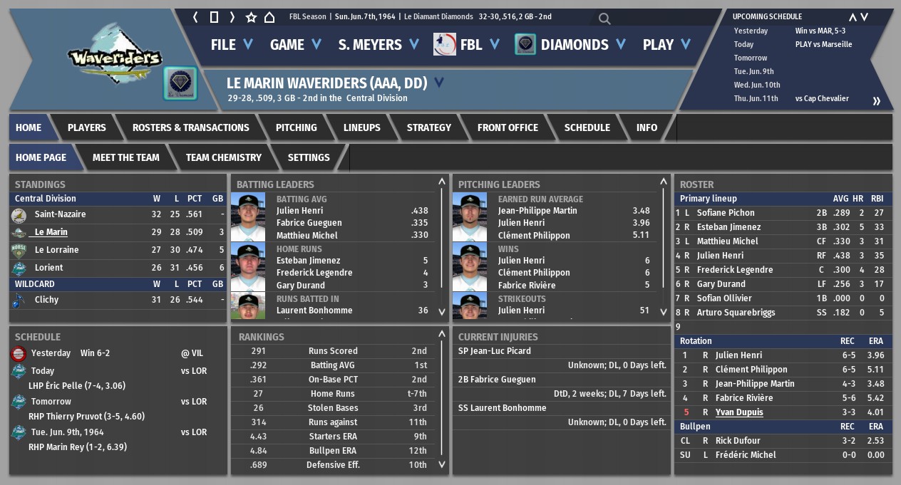 Here is a snapshot of the Pitching Leaders in the FBL. Le Diamant has a few players included in the leader board.