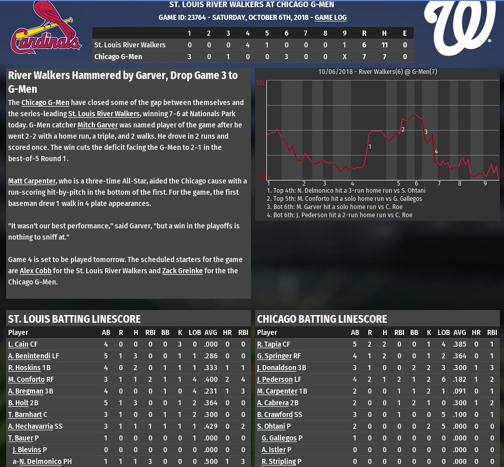 Gyorko, who had a two-run double in a series-opening win and a solo homer in a Game 2 victory, opened the inning with a double off Healy. A two-run homer from Josh Donaldson off Keone Kela in the bottom of the eighth inning had tied it 4-4. St. Louis reliever Sean Doolittle retired Chicago in order in the ninth inning. Then, with the lead, he recorded two more outs in the 10th before allowing a single to George Springer. Jonathon Holder then stepped in and got Donaldson to end it, and send the River Walkers onto the World Series. St. Louis starting pitcher Alex Cobb gave up single runs in the first and third innings, but managed to pitch into the sixth to help lessen the load on a bullpen that carried the River Walkers through the series. |