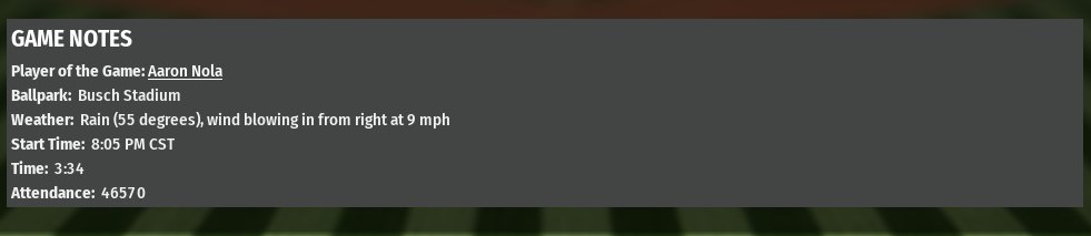 The Walkers' wasted little time take control of the game after falling behind for the second consecutive game. They scored four runs in the bottom of the first off Dayton starter Charlie Morton. Alex Bregman drove in the first run when he was hit by a pitch with the bases loaded. A Brock Holt sacrifice fly plated the second run. A two-out double from Tucker Barnhart made it 4-0. St. Louis added three more runs in the second to break it open.Rhys Hoskins had an RBI double. Michael Conforto plated two with his fourth homer of the postseason. Nola allowed one run on four hits in his seven innings. He struck out five and walked one. |