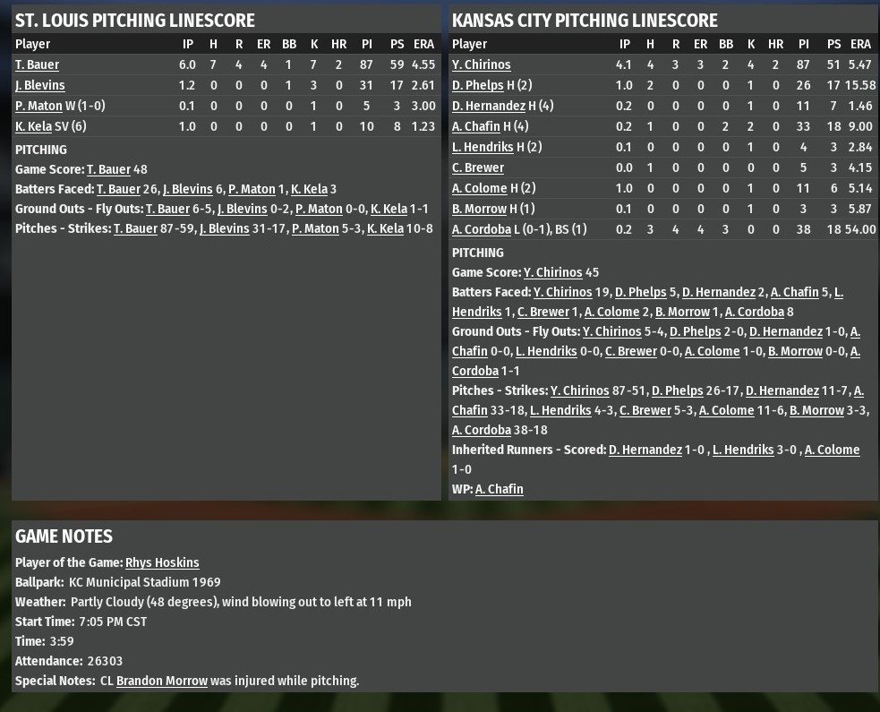 Masters reliever Brendan Morrow struck out Jedd Gyorko to open the inning, but had to leave the game with an abdominal injury. Out of relief pitchers, they had used seven since Yonni Chirinos left in the fifth inning, the Masters were forced to press outfielder Allen Cordoba into action on the mound. It did not work out well. The first three batters he faced all reached -- two walks and a single -- to load the bases. Michael Conforto hit into a fielder's choice, Albert Almora being retired at the plate for the second out. However, Tucker Barnhart drew a bases-loaded walk to tie the game. Nicky Delmonico followed with a two-run single, putting St. Louis ahead 6-4. Adeiny Hechavarria followed with another single, making it 7-4. Keone Kela pitched a 1-2-3 ninth to earn his sixth save of the season. St. Louis led 3-2 in the bottom of the fourth, when Aaron Altherr hit a two-run homer off Trevor Bauer to give Kansas City a 4-3 lead. |