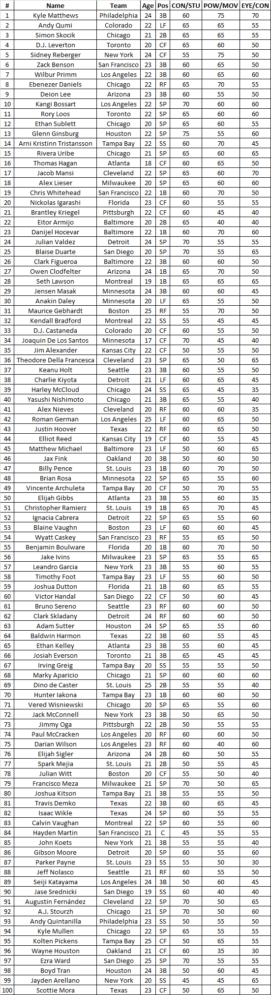 SP Chris Adams (SEA) - 6-3, 1.35 ERA, 93.2 IP, 0.91 WHIP, 4.8 K/9, 3.3 WAR SP Kuma Fukumoto (TOR) - 11-5, 1.94 ERA, 172.0 IP, 0.99 WHIP, 5.2 K/9, 3.3 WAR SP Zach Jensen (KC) - 12-7, 2.25 ERA, 167.2 IP, 1.16 WHIP, 5.6 K/9, 3.7 WAR SP Lee Leary (MIN) - 10-6, 2.05 ERA, 162.2 IP, 1.22 WHIP, 4.3 K/9, 3.3 WAR SP Devon McFadden (DET) - 9-10, 2.42 ERA, 178.1 IP, 1.23 WHIP, 4.8 K/9, 4.3 WAR SP Jeremy Thompson (MIN) - 13-7, 2.73 ERA, 178.1 IP, 1.27 WHIP, 3.7 K/9, 3.7 WAR CL Dominic Burkhardt (DET) - 2-3, 28 SV, 1.44 ERA, 50.0 IP, 0.88 WHIP, 4.3 K/9, 1.1 WAR CL Jason Fehr (TOR) - 3-5, 23 SV, 1.71 ERA, 58.0 IP, 1.00 WHIP, 4.3 K/9, 0.9 WAR CL Boris St. Laurent (LAA) - 7-3, 21 SV, 1.42 ERA, 44.1 IP, 1.17 WHIP, 5.3 K/9, 0.3 WAR CL Patrick Trezeguet (BAL) - 5-3, 26 SV, 1.32 ERA, 54.2 IP, 1.24 WHIP, 8.1 K/9, 1.1 WAR C Howard Morris (NYY) - .297/.365/.385, 182 AB, 2 HR, 136 wRC+, 1.9 WAR C Joseph Williams (HOU) - .247/.343/.313, 182 AB, 1 HR, 104 wRC+, 1.4 WAR C Joon-Suh Yun (MIN) - .249/.324/.309, 249 AB, 3 HR, 1 SB, 91 wRC+, 1.9 WAR 1B Heath Tremblay (TB) - .337/.387/.395, 306 AB, 2 HR, 1 SB, 148 wRC+, 2.9 WAR 2B Jimmy Keller (TOR) - .251/.326/.352, 347 AB, 4 HR, 20 SB, 112 wRC+, 2.2 WAR 3B Alonso Carvajal (NYY) - .323/.393/.457, 313 AB, 2 HR, 51 SB, 157 wRC+, 4.1 WAR (Injured) 3B Oliveiro Mendez (CLE) - .338/.409/.395, 367 AB, 3 HR, 3 SB, 151 wRC+, 3.9 WAR SS Tomas Reed (MIN) - .322/.403/.472, 320 AB, 5 HR, 28 SB, 172 wRC+, 5.6 WAR SS Woody Robertson (KC) - .287/.355/.380, 279 AB, 15 SB, 128 wRC+, 4.6 WAR SS Benny Wurdeman (OAK) - .279/.316/.406, 315 AB, 3 HR, 49 SB, 125 wRC+, 4.0 WAR (Injured) LF Marco Gasca (KC) - .256/.333/.314, 328 AB, 1 HR, 7 SB, 101 wRC+, 3.3 WAR LF Walker Rosen (SEA) - .318/.353/.474, 403 AB, 2 HR, 41 SB, 149 wRC+, 3.6 WAR CF Aiden Shelton (DET) - .264/.352/.344, 352 AB, 2 HR, 50 SB, 111 wRC+, 3.1 WAR RF Wes Grossman (SEA) - .309/.373/.408, 346 AB, 3 HR, 27 SB, 141 wRC+, 2.7 WAR RF Oscar Vaides (LAA) - .303/.352/.351, 370 AB, 17 SB, 117 wRC+, 3.2 WAR National League: SP Henry Angelbeek (SD) - 10-9, 2.80 ERA, 173.2 IP, 1.19 WHIP, 3.6 K/9, 3.8 WAR SP Alex Campbell (COL) - 6-7, 1.97 ERA, 160.0 IP, 1.04 WHIP, 4.1 K/9, 3.3 WAR SP Dean Davidson (PHI) - 8-6, 1.29 ERA, 167.0 IP, 1.12 WHIP, 4.5 K/9, 3.6 WAR SP Jonathan Kinnunen (MON) - 11-5, 2.14 ERA, 172.1 IP, 1.17 WHIP, 4.4 K/9, 3.4 WAR SP Simon Walker (STL) - 10-6, 2.06 ERA, 135.2 IP, 1.05 WHIP, 3.8 K/9, 3.6 WAR SP Goran Williams (COL) - 8-7, 2.50 ERA, 151.1 IP, 1.10 WHIP, 3.2 K/9, 3.6 WAR RP Ryan Anderson (CIN) - 5-1, 1.60 ERA, 67.2 IP, 1.15 WHIP, 4.5 K/9, 0.5 WAR CL Evan Borich (NYM) - 2-3, 16 SV, 1.80 ERA, 40.0 IP, 1.02 WHIP, 6.1 K/9, 1.3 WAR CL Yowelfy Jiménez (PIT) - 4-4, 22 SV, 1.74 ERA, 46.2 IP, 1.11 WHIP, 2.7 K/9, 0.5 WAR CL Clement Link (FLA) - 2-2, 23 SV, 1.13 ERA, 56.0 IP, 0.84 WHIP, 7.6 K/9, 2.4 WAR C Dylan Bielecki (COL) - .236/.346/.293, 174 AB, 1 SB, 101 wRC+, 1.4 WAR C Oscar Namuangrak (PIT) - .265/.307/.422, 166 AB, 3 HR, 130 wRC+, 1.7 WAR C Peter Romero (STL) - .262/.319/.353, 252 AB, 4 SB, 109 wRC+, 1.8 WAR 1B Jim Byers (FLA) - .291/.366/.364, 374 AB, 3 HR, 1 SB, 129 wRC+, 3.0 WAR 2B Cezár Castaneda (PIT) - .294/.362/.358, 394 AB, 72 SB, 125 wRC+, 4.9 WAR 2B Jacob Leuty (CHC) - .290/.352/.395, 362 AB, 2 HR, 1 SB, 134 wRC+, 3.1 WAR 2B Osorio Trujillo (FLA) - .295/.329/.390, 400 AB, 30 SB, 119 wRC+, 5.0 WAR 2B Nic Wiener (STL) - .299/.361/.364, 374 AB, 3 HR, 45 SB, 119 wRC+, 3.2 WAR 3B Danny Hurst (LAD) - .308/.363/.381, 383 AB, 3 HR, 5 SB, 136 wRC+, 3.1 WAR SS Jack Dulude (LAD) - .230/.318/.289, 256 AB, 10 SB, 91 wRC+, 3.5 WAR LF Vic Talarico (STL) - .244/.309/.362, 312 AB, 2 HR, 14 SB, 104 wRC+, 2.3 WAR CF Mitsuo Azuma (MIL) - .267/.326/.329, 356 AB, 1 HR, 46 SB, 105 wRC+, 3.1 WAR CF Geraldo Morales (NYM) - .241/.294/.348, 374 AB, 22 SB, 103 wRC+, 2.9 WAR CF Vladimiro Trejo (FLA) - .358/.446/.477, 371 AB, 1 HR, 62 SB, 174 wRC+, 5.4 WAR RF Noel Albert (SF) - .263/.352/.326, 350 AB, 2 HR, 5 SB, 117 wRC+, 2.1 WAR (Injured) |