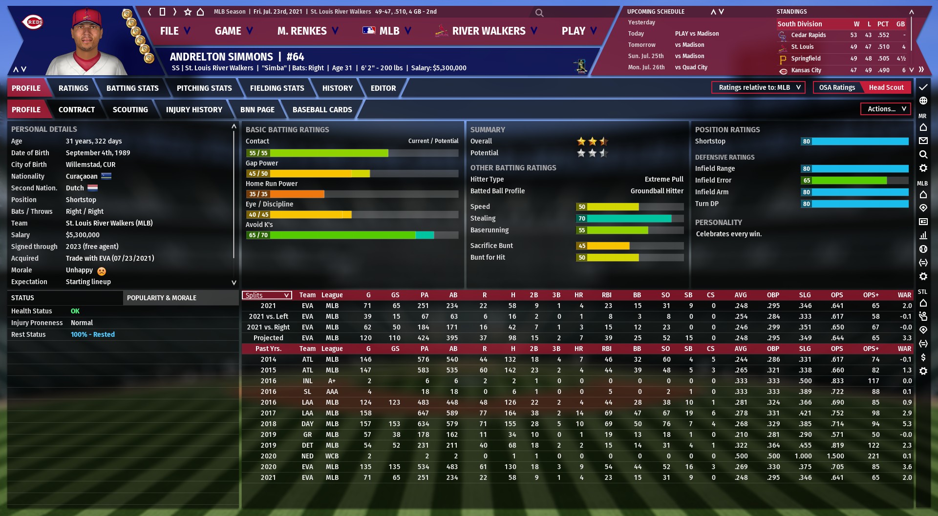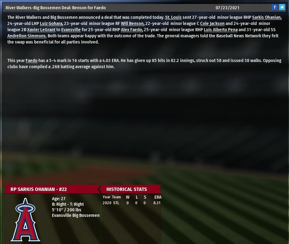 Going from St. Louis to Evansville are, minor-league (Class AAA) outfielder Will Benson, starting pitcher Luiz Gohara, minor-league (Class AAA) right-handed relief pitcher Sarkis Ohanian, minor league (Class A) catcher Cole Jackson and minor league (Class A) second baseman Xavier LeGrant. In return, the River Walkers receive right-handed major league pitcher Alex Faedo, major league shortstop Andrellton Simmons, right-handed minor-league (Class AA) relief pitcher Luis Alberto Pena. The big losses for St. Louis are Gohara, Benson and Ohanian. Gohara is in his fourth season as part of the River Walkers rotation, but after going 22-9 over his first three seasons, he has gone 6-9 with a 6.75 ERA in 2021. Seen as a possible starter in the outfield, with Michael Conforto likely to test free agency in the outfield, Benson has played most of this season at Memphis where he is hitting .294 with 13 homers and 47 RBIs. The emergence of outfielder Tyler Esplin, he is hitting .270 with 20 homers and 71 RBIs for Memphis, helped make Benson seem expendable. The 27-year-old Ohanian looks like he might be ready for the majors in 2022, after a solid season at Memphis this year. He is 2-4 with 17 saves and a 3.55 ERA this season for the Redbirds. Jackson and LeGrant are low-level prospects at best. Coming from Evansville, the big piece is Faedo who his ranked as the 10th best pitching prospect in baseball. This season, the 25-year-old right-hander has gone 5-4 with a 4.03 ERA in 16 starts for the Bossemen. The 25-year-old Pena has split his season between A and AA Mobile. In 19 games at AA, Pena has gone 1-2 in 19 appearances posting a 1.29 ERA and five saves. The acquisition of Simmons was primarily a moneydrop for the Bosseman, although the 31-year-old shortstop still plays gold-glove caliber defense. In 2021, Simmons is batting .248 with four homers and 23 RBIs. Since Adeiny Hechavarria and Simmons can only play shortstop, the Walkers may look to make another deal in the days leading up to the trade deadline. |