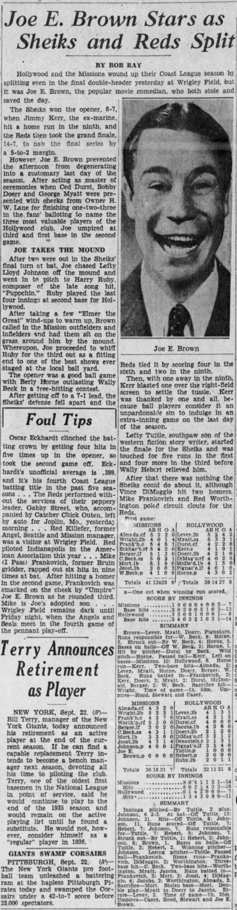 The 1935 Hollywood Stars provided something special in the way of entertainment for their closing games of the season. For one thing, they played a closing day double header against the Mission Reds. The second game had some features that would not be permitted today. Songwriter Harry Ruby who left his pro baseball aspirations behind to write songs for the Marx Brothers, among others, suited up for the Stars and played second base. Comic actor Joe E. Brown was permitted to umpire and then entered the game as pitcher for the opposing Mission Reds. He struck out Ruby, who was the only batter he faced. Both players are listed in baseball-reference: