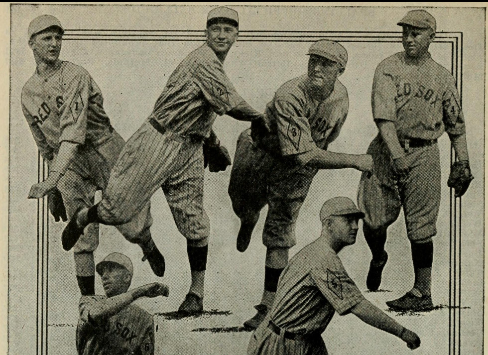 Charlie Small, rookie outfielder, in the Boston Globe on 8/21/30, wearing the arm patch recognizing the 300 year anniversary of the city of Boston.