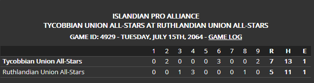 Wednesday, July 16, 2064 TU STARS TRIUMPH OVER RU STARS ON GILFORD CLOUT Old habits are hard to break... for the 44th time in 64 clashes in the Islandian Pro All-Star Classic the Tycobbian Stars triumphed over the Ruthlandian Stars... this time they won it 7-5 on a two-run homer by Elvis Gilford (Mahaska) in the top of the ninth. It was a good baseball game that seesawed back-and-forth... the TU All-Stars struck first in the second frame on a two-run homer by Odell Overstreet (Tuckanarra)... in the third Eliot Marcum (Belle Plaine) got one of them back for the RU All-Stars with a solo swat... Ruthlandia jumped into the lead with three runs in the fourth on RBI singles by Klaus Dittmer (Far Mountain) and Timmy Benford (Valmara)... another one came via a wild pitch. Both clubs hit the ball well... the Tycobbian Stars cracked 13 hits and the Ruthlandian Stars collected 11... Teddy Stonich (Rolling Hills) sparked them with three hits and two runs scored... Elvis Gilford, the game's Most Valuable Player, had two hits, two runs and two ribbies... the TU Stars took the lead 5-4 in the sixth on a sac fly by Donald Wren (Luxora) and a two-run single by Bob Purkey (South Fork)... Ruthlandia evened it all up 5-5 when Teddy Knox (Elnora) got hit by a pitch, was bunted to second and came across to score on Dan Timmons's base hit.... Timmons (Taranto), Benford (Valmara) and Jordy Olsen (Fort Benton) paced the RU All-Stars with two hits apiece. Last edited by Eugene Church; 08-06-2020 at 05:03 PM. |