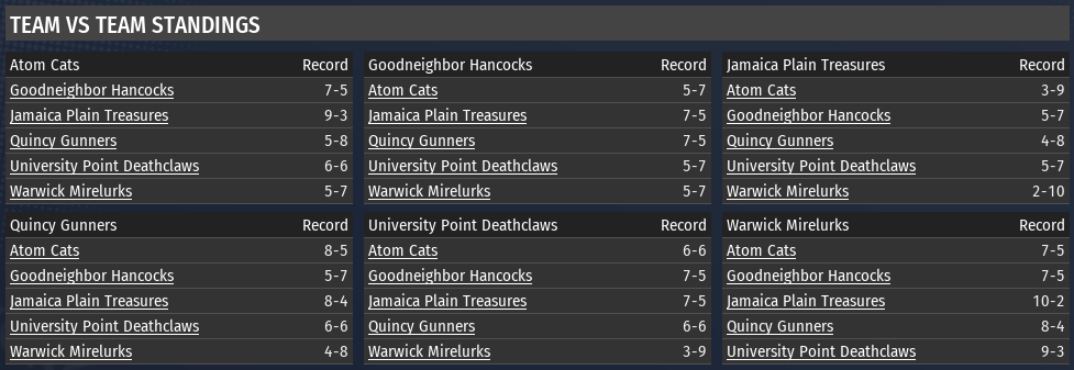 Series - Week 1 is two games at lower-seed teams Week 2 is one through three games at higher-seed teams #8 Atom Cats (32-29) vs #1 Oberland T-51s (41-19) #5 Egret Scrappers (35-25) vs #4 Abernathy Adamantium (36-24) #6 Starlight Lady Killers (34-26) vs #3 Finch Farm Four Leafs (37-23) #7 The Slog Ghouls (32-29) vs #2 Warwick Mirelurks (41-19) Playoff Tree