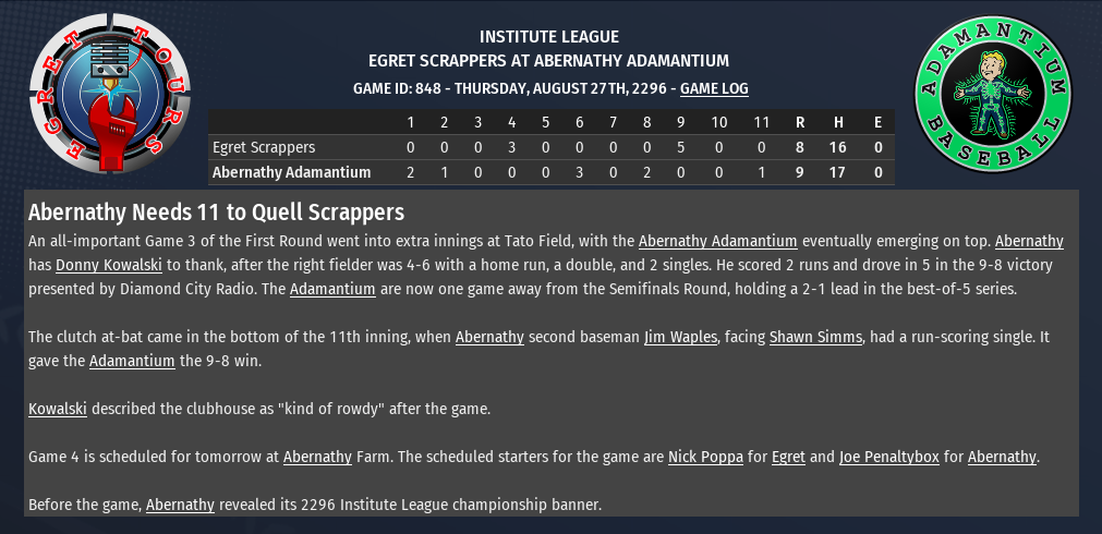 I also decided to add the boxscores instead of just the stories. No full linescores just yet. The nest post will be more organized. Today in the CBO News and Notes - Reports from around the Commonwealth by Nat Wright-Kowalski 20 August 2296 - Warwick Escapes in The Slog The Warwick Mirelurks took a 1-0 series lead, downing the The Slog Ghouls on the road at Tarberry Field Forever by a score of 8-7. Mirelurks center fielder Warwick Homestead went 5-5 with 2 doubles and 3 singles. He scored 2 runs and drove in 3. In the top of the first, with the game still scoreless, Homestead hit a run-scoring double to put his team in the lead. "Huge," Homestead said. "Getting a win in the first playoff game is huge." The next game is scheduled for tomorrow in The Slog. Slated to start are Justin Sphinx for the Warwick Mirelurks and Gary Estate for The Slog Ghouls. 20 August 2296 - Super Swinger -- Homestead Slams 5 Hits It doesn't happen very often, but it did for Warwick Homestead today -- a 5-hit effort. He went on a rampage at Tarberry Field Forever and paced the Mirelurks to a 8-7 win over The Slog Ghouls. After his dynamite batting performance, the Warwick center fielder told reporters that he "just tried to get in a good count and have a good at-bat. That's all I can control." His philosophy paid dividends today. He slammed 5 hits in 5 tries and put his name in the record book. Warwick Homestead hit an RBI double in the 1st, singled in the 3rd, doubled in the 5th, hit a two-run single in the 6th and singled in the 8th. In his stats this season, Homestead has posted a batting average of .353 with 95 hits in 269 at-bats, 5 home runs and 53 RBIs. He has also scored 51 runs, walked 16 times and compiled a .388 OBP. 20 August 2296 - Lady Killers Hammered by Basile, Fall Back 1-0 Finch Farm Four Leafs right fielder Matt Basile was the difference-maker at Valentine Detective Agency Field today, as he led his club to victory in a pivotal Game 1 of the Quarterfinals. The Four Leafs took the 11-4 win over the Starlight Lady Killers to seize a 1-0 lead in the best-of-5 series presented by Diamond City Radio. In the top of the first, with the game still scoreless, Basile hit a run-scoring single to put his team in the lead. The Four Leafs never trailed. "We're going to have to play flawless baseball from here on out," Starlight player-coach and losing pitcher City Moore said. "Which, let's face it, we haven't been doing lately." The next game is set to be played tomorrow. Slated to start are Steve Rocky for the Finch Farm Four Leafs and Enrique Rodriguez for the Starlight Lady Killers. 20 August 2296 - Cats Shut Out 51s in Game 1 Matchup Matt "Ace in the Hole" Hope knew he couldn't win the series for the Atom Cats because it would take a lot more than one start. The best he could do, he figured, was put the Cats up a game and give the Coolest Field in Town faithful a good time. Check and check. The Atom right-hander threw a complete-game shutout against the red-hot Oberland T-51s to get the Cats on the board in the series, striking out 2 along the way. The Cats will be looking to keep the momentum the next time the teams meet. With the 5-0 win, Atom now leads 1-0 in the best-of-5 series presented by WRVR. The T-51s had trouble solving Hope, who surrendered no runs on 5 hits over 9 innings. "I'll be honest," said Hope, "I didn't have much left in the tank." The next game is set to be played tomorrow at Coolest Field in Town. The scheduled starters for the game are Matt Udder for Oberland and Wyatt Wallace for Atom. 20 August 2296 - Oberland Blanked by Hope Everything clicked on the hill today for Matt "Ace in the Hole" Hope as he hurled the Atom Cats to a 5-0 shutout win over the Oberland T-51s, limiting them to 5 hits while recording 2 strikeouts and yielding 3 walks. He overpowered some batters with fastballs and buckled knees with sharp breaking pitches. "We had our shot at him a couple of different times," T-51s player-coach Jonathan Abern said. "We just weren't able to get to him." Hope has made 21 starts, tossed 126.1 innings, struck out 76 batters and walked 46. His record is 7-8 with a 7.05 ERA and he has limited other teams to a .317 batting average. 30 August 2296 - Big 9th Propels Abernathy Abernathy shortstop Austin Engill was the key at Fallon Field at Egret Tours Marina today, as he powered the Adamantium to victory in a critical Game 1 of the First Round. The Adamantium took the 12-9 win over the Egret Scrappers to seize a 1-0 lead in the best-of-5 series. Abernathy used a clutch hit from Kevin Covert to get the win. The pinch hitter drilled a grand slam home run in the top of the ninth inning to put the Adamantium ahead, 12-9. It was his only hit in 1 at-bat, but it was a game-changer. "Every team in baseball loses," Scrappers player-coach Troy Phillabum said. "We're in the playoffs and we still have the same guys that got us here. We'll bounce back." The next game is scheduled for tomorrow at Fallon Field at Egret Tours Marina. The scheduled starters for the game are Joe Penaltybox for the Abernathy Adamantium and Nick Poppa for the Egret Scrappers.