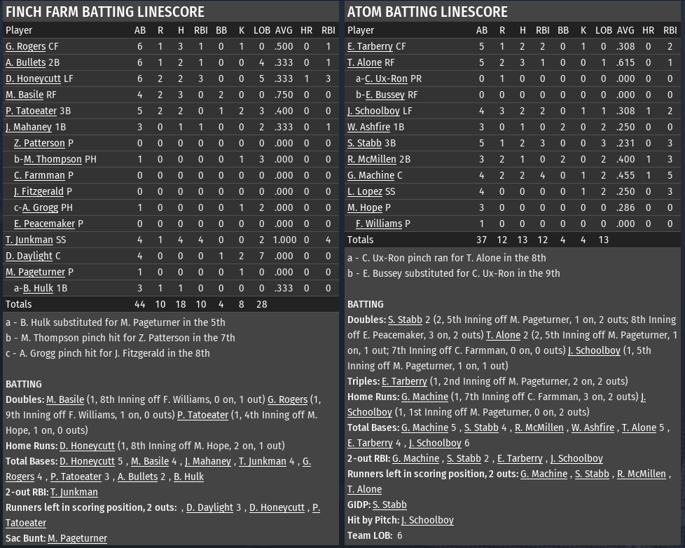 Today in the CBO News and Notes - Reports from around the Commonwealth by Nat Wright-Kowalski 9 September 2296 - Small Bertha Taking Her Business Elsewhere Small Bertha and Vim! Corporation announced that the company was moving its sponsorship from Sunshine Tidings to a location much closer to Bertha's home on Mount Desert Island. Vim! will become the sponsor of the Salem Witch Hats beginning in the 2297 season. In addition, Bertha has worked out a deal to expand the sponsorship of the team beyond just the Witch Hats. She has worked out an exclusive rights deal that Vim! will be the sole drink product of all home Brotherhood League stadiums. The six teams of the Brotherhood League--Salem, County Crossing, East Boston Prep, Finch Farm, Nordhagen Beach, and The Slog--will begin that exclusive rights deal in 2297. Bertha called the move a win for her, the Witch Hats, and the Brotherhood League. She said that travel from Maine to west of Boston had been tiresome, so it would be nicer to travel from the northeast area of the Boston Commonwealth to save time. "Port to port," she said. Nate Howard did not release a statement but did state that he had approved both the deals and announcement. More information will come as it is available. Bertha will claim no stock in the Witch Hats organization nor make any changes to the team. The Vim! logo will appear at all six stadiums and all Brotherhood League correspondence. All radio and TV broadcasts of games will also mention the Vim! name when covering Brotherhood League games. Talia McGovern, owner of the Sunshine Tidings Chemists, also released a short statement: "I am relieved to have the chance to work with another company in the Commonwealth." McGovern and Bertha had a tumultuous relationship since the beginning of their partnership. Apparently, Bertha had ordered McGovern to draft Bertha's brother Tony Bertha. Instead, McGovern selected Front Porch Potter, which threw Small Bertha into a rage. McGovern was seen sporting a shiner on her eye shortly after, leading many to believe Small Bertha was responsible. After insistence, McGovern agreed to a three-way trade among the Chemists, Starlight Lady Killers, and County Crossing Bloodbugs that included a total of 12 players, including Tony Bertha and Potter. Tony Bertha did not enjoy a particularly successful first season with the Chemists. In 20 starts, he finished with a 6-9 record and a 5.15 ERA. He also released a short statement: "I understand if Ms. McGovern wishes to get rid of me now that my sister has moved on, but I want it to be on record that I like it here in Sunshine Tidings, and I will work hard to win a championship here if I am here next year." McGovern has indicated that she is thrilled that there will be full staffs for the 2297 season and mentioned that she would leave all personnel decisions to the staff. For the Salem Witch Hats, they are happy to welcome Vim! after the disappointment of not receiving a sponsorship from John-Caleb Bradberton and Nuka-Cola. Team owner Barney Rook was insistent that the team remain as it is, thus spurning Kasumi Nakano's offer. Small Bertha stated that she was happy to put the Vim! name on the stadium and the Vim! products in Brotherhood League stadiums, so she was content to make money. As she put it, in Salem she would be "hands off." McGovern probably wishes that was true in Sunshine Tidings.