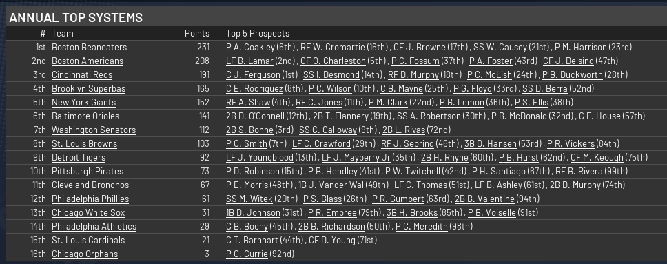 ![]() I can't believe both Boston teams have such stacked minor league clubs. Well, I didn't take into account each Footnote League team has only 1 farm club, right? I suppose a single top prospect, or lack thereof, could impact a team's farm club ranking quite a bit. I'll be keeping an eye on my team, the Baltimore Orioles, as beginning next season they will forever be home in New York. (They didn't take the nickname Yankees until sometime around 1912-1914). I'll be keeping an eye on Oriole's Top Prospect, 2B Danny O'Connell.