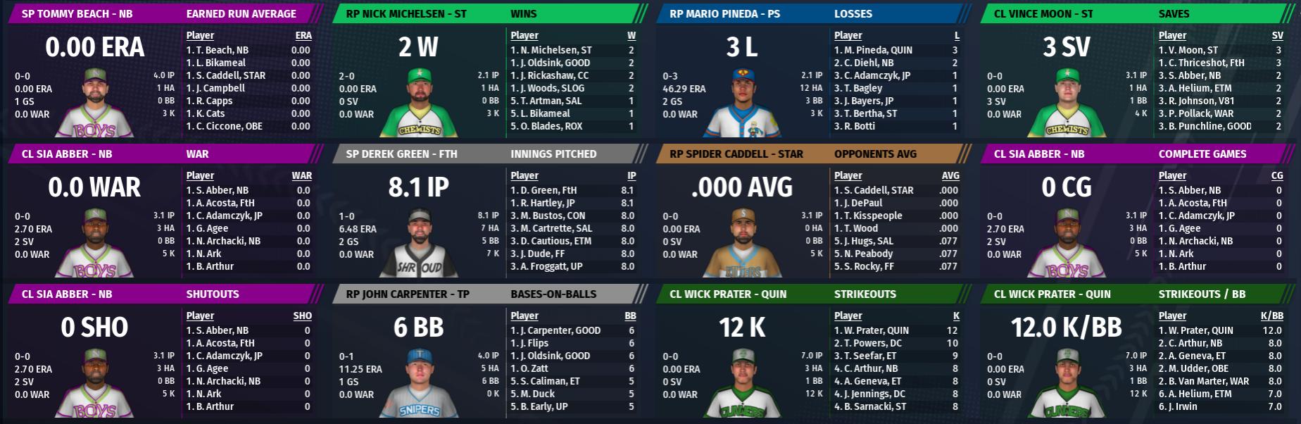 ![]() BATTLE FOR THE NORTH TOURNAMENT #5 Warwick 8 at #1 Nordhagen Beach 4 Mirelurks 2B Brad Krol was 3 for 5, including a two-run 4th inning home run that put his team up for good. He scored a run and drove in three for the Game MVP honors, eliminating the Party Boys from the tournament at their home stadium. Nordhagen Beach's Brian Masterson was 4 for 4 with a solo home run in the 6th. Warwick's Shane Notemen hit two doubles and drove in two. #3 Fort Hagen 2 vs #2 FHE 8 The Yao Guai's Papa Bush pitched 7.0 innings, allowing just one earned run on seven hits with three walks and seven strikeouts. He also hit a three-run home run as part of a six-run 6th to propel FHE to victory and eliminate the three-seed Shroud. All seven of Fort Hagen's hits were singles. Nick Waterpipe added two hits for the Yao Guai with a double and two RBI. BATTLE FOR THE SOUTH TOURNAMENT #7 Vault 81 15 vs #6 Sunshine Tidings 14, 11 inn. In a back-and-forth game, the Dwellers scored two in the 11th to top the Chemists' one for a thrilling 15-14 victory. The game featured a total of seven home runs, including Cory Macon's go-ahead solo shot in the top of the 11th. Sunshine Tidings' Joe Provisioner was the game MVP with an impressive stat line of 4 for 5 with two doubles, a home run, two walks, three runs scored, and four RBI. In addition to Macon's homer, Knud Bather, Mark Dombrowski, Ronald Raygun, and reigning MVP Deer Quickwalker went deep for the suddenly imposing offensive Dwellers. Seven Dwellers also doubled. Rookie CF Aesed Hayjen was 3 for 6 with a double, a run, and four RBI. #8 Starlight 14 vs #2 Quincy 4 The Lady Killers blasted the #2 seed Gunners by scoring five runs in each of the 6th and 7th innings, eliminating Quincy from the tournament. Rookie 1B Zeldolph Violet was the Game MVP, going 2 for 3 with a double, two walks, two runs, and two RBI. Skinny Danner and Wild Cannon each drove in three runs for Starlight. Andrew Nuka and Robbie Adams each picked up three hits for Quincy. Jesus Church doubled twice.