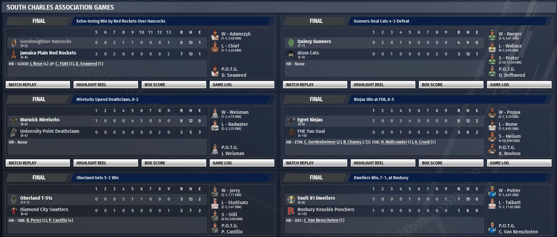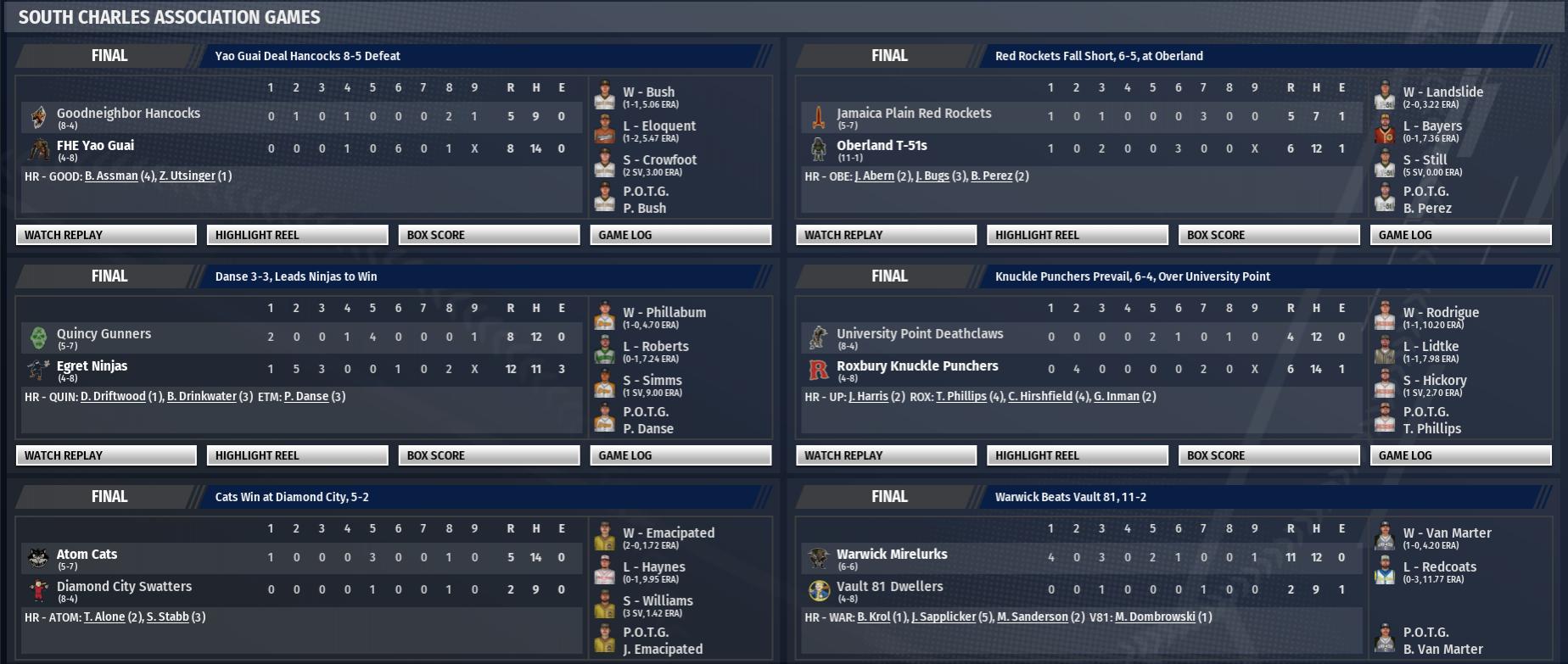 Today in the CBO News and Notes - Reports from around the Commonwealth by Nat Wright-Kowalski 18 April 2298 - Tykeson Has Historical Day in BMU Game Taffington Boathouse Spy Hunters first baseman Lannie Tykeson almost did it all today. He sent three shots out of the ballpark, scored 3 times and drove in 8 runs and had 5 hits in 5 at-bats. The one thing he could not do, however, was lead the Spy Hunters to victory. The Outpost Zimonja Strongbacks escaped with the 15-11 win by the Outpost Zimonja despite being on the receiving end of the barrage from Tykeson. "I'd be lying if I said I didn't like hitting three homers, but losing takes a little glitter off the game," he admitted to BNN writers after the game. Lannie Tykeson hit a three-run home run off Bobby DeLaune in the 1st, hit a two-run home run off Bobby DeLaune in the 3rd, singled in the 5th, singled in the 8th and hit a three-run home run off Troy Kisspeople in the 9th. "When someone hits three home runs, you put yourself in a tough position to win," said Taffington Boathouse manager Tim Haysneedle. "We were lucky to win this one. I don't think it matters how hard you throw, especially in the Commonwealth Association. If you leave a ball out over the plate to good Boston Minor Union hitters, if they get a bead on you and you leave it over the middle, they're probably going to take a good hack at it." To date this year Tykeson is batting .480 with 3 home runs. "Tykeson was really good, we were just a little better," said Strongbacks manager David Troutman in the postgame interview. "It's all right with me if he gets 5 hits every game against us, as long as we win." 19 April 2298 - Tiller Hits 2 home Runs in Shroud Win in Heavyweight Battle The Fort Hagen Silver Shroud downed the Easy Town Assaultrons, 7-3, at Hubris Comics Park. The Silver Shroud were led by Jim Tiller. He went 4 for 4 with 2 home runs and 2 singles, while scoring 3 runs and driving in 4. Brent Hooker, the winner, improved to 2-1. He held the Assaultrons to 2 runs on 6 hits over 8 innings, while striking out 11 and walking 1. Easy Town falls to 8-3. Tiller had a key at-bat for Fort Hagen early in the game. With a runner on 2nd, he hit a 2-run home run. It was his 4th home run of the season and gave Fort Hagen an early 2-0 lead. Tiller attributed the win to "a well-rounded effort by the whole team." 19 April 2298 - Vault 81 Wins, Raygun Has 3 Hit Night The Vault 81 Dwellers topped the Warwick Mirelurks, 13-6, in South Charles Association action at CURIE Inc. Field. The game was highlighted by the performance of Vault 81 catcher Ronald Raygun. Vault 81 reliever Nick Radio got the win, raising his record to 1-0. John Diner was tagged with the loss. The Mirelurks drop to 5-6 and continue their inconsistent start to the 2298 season. In the first inning, Raygun had a grand slam home run for Vault 81. It was his 1st home run of the season and put the Dwellers on top, 6-0. "We'll pop the top on a cold beverage and get back to work tomorrow," Raygun said. 19 April 2298 - Fogcrawler Slugs Party Boys to 8-1 Win Led by Michael Fogcrawler, the Nordhagen Beach Party Boys defeated the Concord Radstags, 8-1. Fogcrawler belted 2 home runs. He drove in 5 runs and scored twice for the Party Boys. The win puts Nordhagen Beach at 7-4. With Nordhagen Beach leading 2-0 in the top of the fifth, Fogcrawler hit a fastball from Phil Cecil for a 3-run home run. It was his 6th home run of the season and put the Party Boys ahead, 5-0. "I just tried to make good contact," said Fogcrawler. 19 April 2298 - T-51s Win 3-2 Walk-Off Oberland picked up a win at Graygarden Park, toppling the Jamaica Plain Red Rockets, 3-2. Pitcher Matt Udder was one of the reasons the T-51s triumphed. The Red Rockets drop to 5-6 and continue their inconsistent start to the 2298 season. Prof Castillo was the walk-off hero for Oberland. With the game tied in the bottom of the ninth inning, the T-51s left fielder hit a dramatic run-scoring single to send the teams home. Castillo called the win the result of "everyone being in sync."