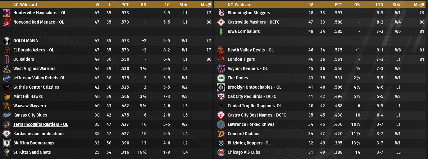 By the way, I can't find anything for diamond. The universe tab still has no playoff results at all. As far as I can tell, Laramie, Palolo, and Kansas made the playoffs. Perhaps someone from diamond can update. |