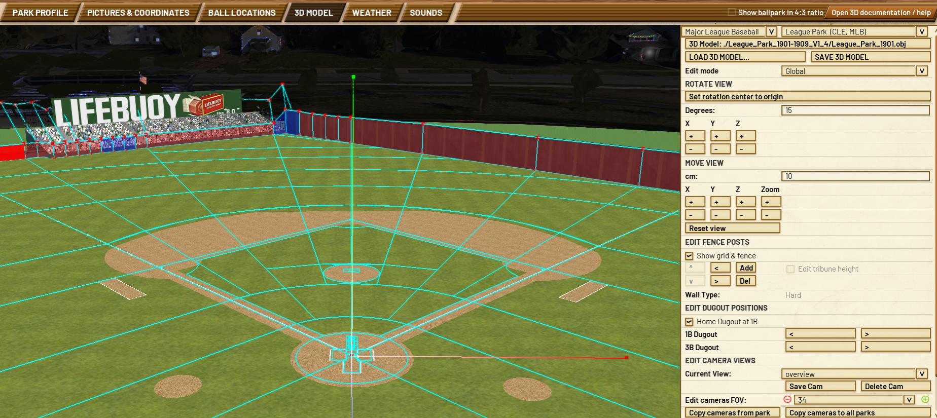 This is the specific example I'm talking about. As you can see from the in-game image the right-fielder is actually positioned behind the right field wall, and not matter how much I try to drag him forward he will not move. The other image shows where I moved him in the editor, but when I start a game at this field he is always symmetrical with the left fielder and not where I moved him. Are you saying that I need to edit something different to position him for using the 3D view?