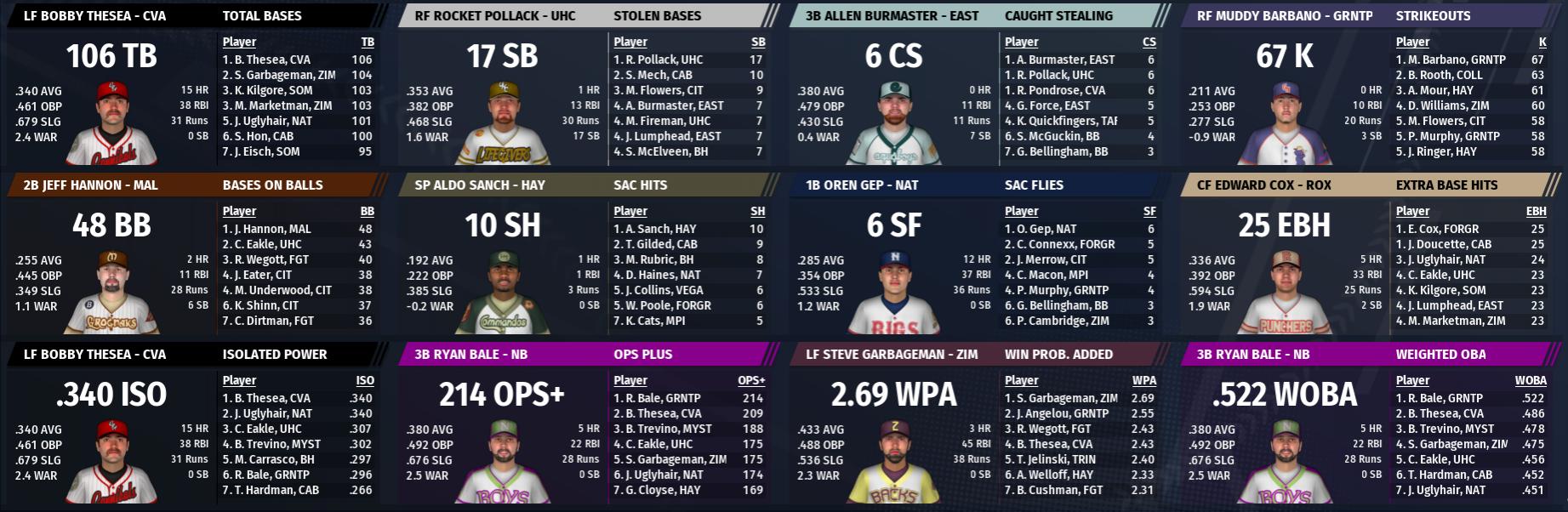 SP - Tim Fusion, Diamond City - 11-3, 2.32 ERA RP - Aaron Still, Oberland - 4-0, 0.53 ERA C - Stuart Costantino, Quincy .395/10/52 1B - Bryan Assman, Goodneighbor, .372/13/52 2B - Brian Masterson, Nordhagen Beach, .377/10/44 3B - Ben Pettinato, Quincy, .339/6/40 SS - Austin Engill, Abernathy, .316/16/52 LF - Michael Fogcrawler, Nordhagen Beach, .359/22/71 CF - Jukebox Luttrell, University Point, .341/17/44 RF - Wayne Lacy, Diamond City, .374/25/68 MVP - Wayne Lacy, Diamond City CBO Statistical Leaders at the All-Star Break