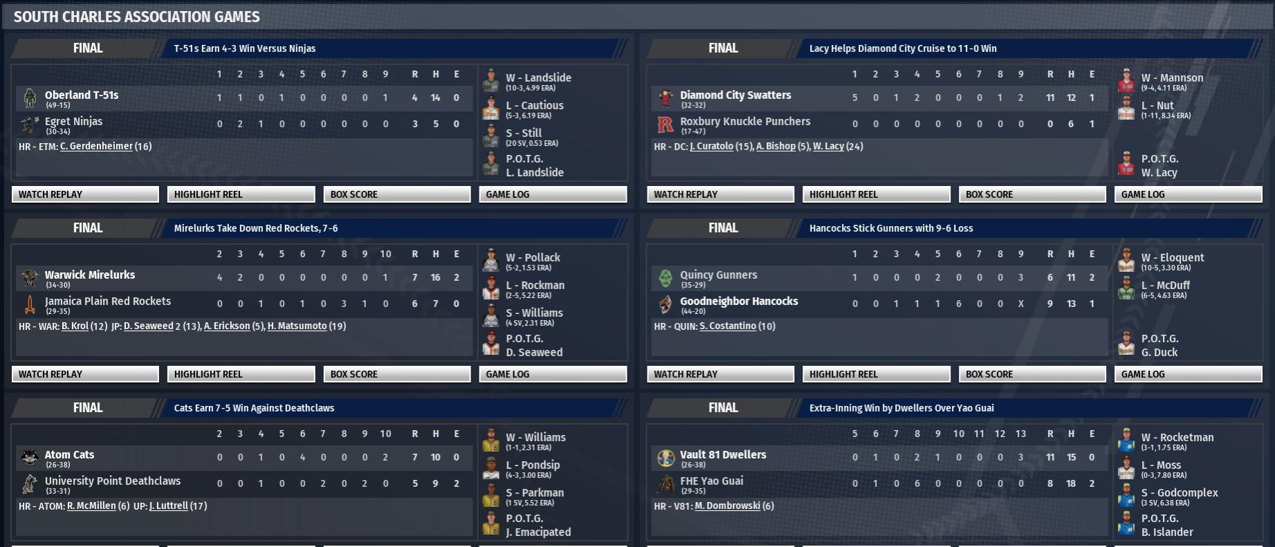 Today in the CBO News and Notes - Reports from around the Commonwealth by Nat Wright-Kawolski 2 July 2298 - Ghouls Rough Up Four Leafs, 11-2, Move into 2nd The The Slog Ghouls beat the Finch Farm Four Leafs, 11-2, at Finch Family Park. Boots Yellowhair, in particular, was impressive. He went 2 for 2 with 2 home runs and 2 walks. He drove in 4 runs and scored twice. The Slog now has a record of 35-29 with the win. The Slog used the bat of Kyle Whale to get the win. The left fielder hammered a 3-run home run in the top of the first inning to put the Ghouls ahead, 5-0. It was his lone hit in 5 at-bats, but it did its damage. "Things went our way," said Yellowhair. The Ghouls' C.T. Woodard led all players in hits. He was 4 for 4 with four runs scored and an RBI. 2 July 2298 - Beebe Excels in 7-1 Starlight Win The Starlight Lady Killers defeated the Abernathy Adamantium, 7-1, at Valentine Detective Agency Field today. Leading the charge for Starlight was right fielder Damani Beebe. He went 4 for 4 with a home run and 3 singles, while scoring 2 runs and driving in 2. The win for the Lady Killers raised their record to 35-29, placing them just one game back of the Adamantium for first place in the Institute League. Jesus Church hit a 2-run home run off Kyle Clevinger in the bottom of the first, which put the Lady Killers ahead, 2-0. In addition to the homer, Church had 1 single and 1 double, while going 3 for 5. "It was a tough night at the plate," said Abernathy manager Chase Stingwing. 2 July 2298 - Hancocks Stick Gunners with 9-6 Loss The Goodneighbor Hancocks downed the Quincy Gunners, 9-6, at Third Rail Stadium at S. Boston HS. The Hancocks were led by Good Don Duck. He went 4 for 5 with a triple, a double, and 2 singles. He scored 3 times. Quincy Eloquent got the win, improving to 10-5. He pitched 6 innings, giving up 7 hits and 3 runs, while striking out 5 and walking 3. Goodneighbor is now 44-20, 9 games up in the South Charles Association Minutemen League. Goodneighbor took the lead in the bottom of the sixth. With one out and runners on 1st and 3rd, Burtie Cuttooth stroked a run-scoring single to make it 4-3, Hancocks. "We'll pop the top on a cold beverage and get back to work tomorrow," Duck said. 2 July 2298 - Lacy Helps Diamond City Cruise to 11-0 Win The Diamond City Swatters had no problem beating the Roxbury Knuckle Punchers, 11-0, at Atomatoys Stadium at Roxbury. Wayne Lacy led the way and continued his CBO MVP push. He was 3 for 4 with a home run, a double, and was hit by a pitch. He scored 3 runs and drove in 2 for Diamond City. X10-44 Mannson got credit for the win, improving to 9-4. He allowed no runs on 4 hits in 6.1 innings. The Swatters bumped their record to 32-32 with this win. Who knows how it might've ended, had it not been for Prince Billingsley? The Diamond City left fielder had a 2-run single in the top of the first inning to put the Swatters on top, 3-0. For the game, Billingsley had 2 doubles and 1 single in 5 at-bats. "We'll relax tonight and get back after it tomorrow," Lacy said after the game. 2 July 2298 - Masterson Hits 2 Home Runs in Party Boys Win Spirited fans greeted the Easy Town Assaultrons for their clash with the Nordhagen Beach Party Boys. The Nordhagen Beach Party Boys downed the Easy Town Assaultrons, 8-2, at Easy Town Field. Brian Masterson led the way, going 3-for-3 for Nordhagen Beach. Nordhagen Beach improves to 39-25 with the win. They lead their division by 4 games. Michael Fogcrawler, the top prospect, had a direct impact on the outcome. Fogcrawler contributed a 2-run home run in the top of the third inning to put Nordhagen Beach up, 4-0. It was his 21st of the season, putting him one behind teammate Dustin Mart for the NCA lead. "You work hard, day in and day out, hoping to give the fans something to cheer about. Today was a good day," Fogcrawler told the Nordhagen Beach News.