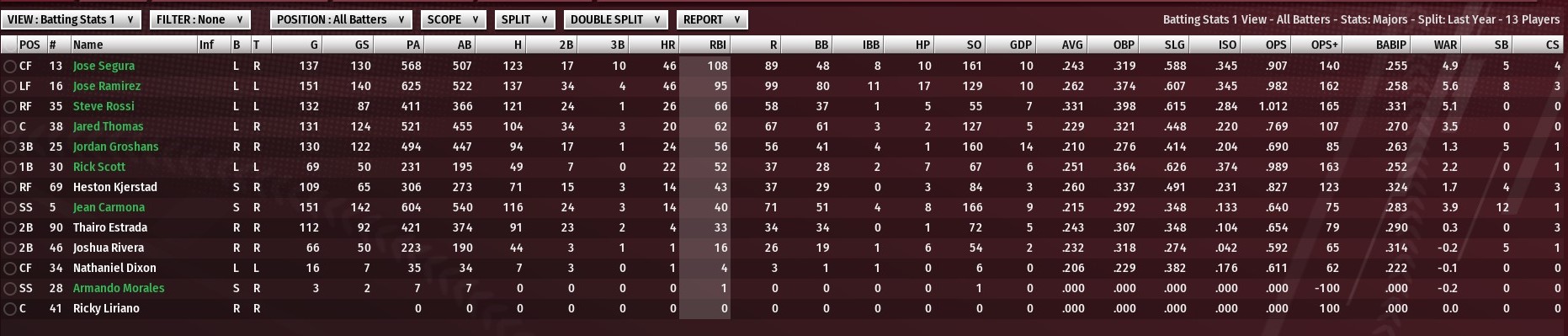 For the first three-and-a-half months, the Walkers simply could not hit, with a team batting average which hovered under .220 going into the All-Star break. The only thing which bailed them out was its pitching staff, as St. Louis went into the break 45-45. But in mid-July something clicked. Maybe it was the team’s hitters finally buying into the philosophy of hitting coach Bobby Segal, who had replaced incumbent Wendell McGee after the team got off to an 8-10. Or maybe it was simply the decision to install left fielder Jose Ramirez at the top of the batting order. No matter what it was, it worked. The Walkers went 48-24 after the break (going 19-10 in August and 20-7 in September) to finish the season 93-69 and win the National League South Division by two games over Springfield. Ramirez, acquired from Rockford before the season, may have been the NL’s best player in the second half. He had struggled getting pitches to hit before the All-Star break – hitting just .211 with 16 homers and 40 RBIs. But sitting atop the order in the second half, he checked in at clip which saw his batting average rise to .262 along with 30 homers and 55 RBIs. Also stepping it up after the break, was rookie first baseman/outfielder Rick Scott, who hit .251 with 21 homers and 48 RBIs over the final 72 games. Meanwhile, center fielder Jose Segura, who had enjoyed a big first half, slowed a little but still hit 15 homers and drove in 43. On the mound Izzy San Juan and Kwan Kawamoto finished season which saw them win 17 and 15 games, respectively. Zach Hunsicker went 8-4 with a 3.26 ERA after being acquired in a trade with Louisville on July 12. Ace Angel Tiburcio suffered a sub-par season after back-to-back Cy Youngs, going 6-9 with a 3.57 ERA before suffering a season-ending torn labrum on August 17. Led by two-time NL reliever of the year Ernesto Barbosa, the St. Louis bullpen ranked among the best in baseball the entire season. In the postseason, the Walkers needed just four games to dispose of Twin Cities in the NL championship series. They followed that with road wins in Games 1 and 2 against Cleveland in the World Series. That pattern of the road team continued for four more games, until Game 7 when Cleveland scratched out a 2-1 win. A two-run homer from Tony Jackson off Hunsicker in the bottom of the seventh giving the Juke Box Heroes the championship. Much of the same cast will be back in 2031. The biggest new addition is second baseman Daniel Becerra, acquired in a trade with Springfield. However, Becerra will be out until at least mid-May after suffering an oblique injury in spring training. Tiburcio enjoyed a good spring and will be back in the No. 1 spot in the starting rotation. The bullpen will be minus long-time lefty Jake Brentz, who suffered a season-ending elbow injury in late September and then retired in the offseason. Also gone is left-hander Jose Alvarado and right-hander Travis Krogman. Looking to fill their roles are righty Andres Hernandez and left-handers Elian Acosta and Ron Peterson. Peterson ranks among the highest-touted young pitchers in the game, but after missing much of the 2030 season with an elbow injury it was thought best for him to at least begin 2031 in the bullpen. NO LONGER HERE 1B – Brian Mundell 37, B-R, T-R, 52 G, .298 BA, 9 HRs, 29 RBIs, .909 OPS; Signed with Ann Arbor Acquired from Fort Wayne via trade in mid-July, Mundell added a much-needed right-handed bat to the bench and occasionally to the lineup. The performance of Scott at first base, lessened the need to bring Mundell back. He also was a captain in the clubhouse. C – Hayden Jones 41 G, .184 BA, 6 HRs, 23 RBIs, .611 OPS; Still a free agent The backup to ironman catcher Jared Thomas, Jones was solid defender and called a good game. IF/OF --- Peter Ahn 32, B-L, T-R, 100 G, .251 BA, 6 HRs, 25 RBIs, .684 OPS; Still a free agent Brought into help handle the second base job. Ahn did a decent job but struggled with some injuries. The Walkers need additional help from the right-side of the plate, so the decision to trade to Becerra made Ahn expendable. IF – Alberto Checchinato, 27, B-S, T-R, 20 G, .161 BA, 0 HRs, 0 RBIs, .438 OPS; Signed with independent league An outstanding defender at second, short and third, Checcinato made a couple of stops in St. Louis but never accomplished much at the plate. OF – Edward Olivares 35, B-R, T-R, 90 G, .194 BA, 11 HRs, 27 RBIs, .646 OPS; Still a free agent Oliveras spent parts of the past five seasons with the River Walkers batting .230 with 45 homers and 103 RBIs over 378 games. His lack of offense in 2030, along with sub-par defense, made it tough to bring him back. OF – Alek Thomas 32, B-L, T-L, 117 G, .220 BA, 2 HRs, 20 RBIs, .611 OPS; Traded to Quad City Thomas did some good things in his time with the Walkers. He first came on board in 2025 before going to Dayton for a season. He then returned for 2027 through 2030. But his numbers saw a significant drop in 2030. For his career in St. Louis, Thomas batted .285 with 33 homers and 236 RBIs in 818 games. The emergence of Nathaniel Dixon at AAA Memphis helped hasten the departure of Thomas. OF – Andrew Benintendi 36, B-L, T-L, 35 G, .222 BA, 2 HRs, 12 RBIs, .633 OPS; retired An original River Walker dating back to the formation of the Midwest Baseball League in 2018, Benintendi was released at mid-season when it was evident there was no place for him to play, and he also was no longer defensively viable. In his career with the Walkers, Benintendi batted .290 with 292 homers and 1,026 RBIs in 1,785 games. Benintendi retired at season’s end. RHP – Travis Krogman 82 G, 7-2, 1 Sv., 2.04 ERA, 88.1 IP, 1.01 WHIP; Signed with Quad City A tough loss as Krogman has ranked as one of the best right-handed relievers in the league during his three seasons in St. Louis, particularly in 2030. Krogman agreed to a three-year deal with the Thunder worth $23.1 million. LHP – Jake Brentz 36, B-L, T-L, 50 G, 4-3, 7 Sv., 1.