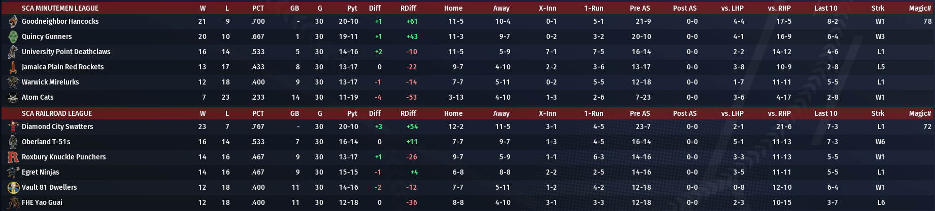 For the first week this season, the Diamond City Swatters are not in first place, at least, not by themselves as the Fort Hagen Silver Shroud used a 4-1 week to boost themselves to the second-best record in the CBO behind the Swatters. The Shroud have been silver hot in May, going 8-2 so far in the month with both losses coming on Wacky Wednesdays. As far as Institute League action, they are an inspiring 6-0 against the Lexington Synths, including the CBO's second-ever no-hitter and two straight shutouts in the series. Starting pitching has been dominant overall, leading the CBO in ERA (2.54) by 1 full point and 16 runs better than Nordhagen Beach for runs allowed (94). Mike Cartrette (6-1, 1.33) threw the no-hitter following his two-hitter last weekend and appears to be on the path to the Pitcher of the Year Award. Brent Hooker (5-1, 3.02) also got in on the shutout action this week. The members of the Top 5 did not change this week, just moved around in order, with BL-leader The Slog at #3, ML-leader Goodneighbor at #4, and ML-wildcard leader Quincy at #5. The bigger story was huge moves up and down the rankings from #7-23. We will feature some of those teams below, with the biggest risers being Oberland, Roxbury, and Concord, and the biggest fallers being FHE, Jamaica Plain, and Easy Town. Atom remains at #24. Weekly Team Power Rankings Here are the current team power rankings for Commonwealth Baseball Organization: Teams (Total Points, Tendency): 1-T) Diamond City Swatters (141.0, o) 1-T) Fort Hagen Silver Shroud (141.0, +2) 3) The Slog Ghouls (134.0, +2) 4) Goodneighbor Hancocks (133.0, -2) 5) Quincy Gunners (125.0, -1) 6) Nordhagen Beach Party Boys (121.0, o) 7) Oberland T-51s (106.0, +10) 8) Starlight Lady Killers (103.0, -1) 9) Abernathy Adamantium (95.0, o) 10) University Point Deathclaws (93.0, +6) 11) Roxbury Knuckle Punchers (85.0, +8) 12) Egret Ninjas (83.0, o) 13) Concord Radstags (77.0, +8) 14) Finch Farm Four Leafs (77.0, o) 15) Vault 81 Dwellers (75.0, +5) 16) County Crossing Bloodbugs (73.0, +7) 17) Warwick Mirelurks (71.0, -2) 18) Sunshine Tidings Chemists (68.0, -7) 19) Jamaica Plain Red Rockets (67.0, -11) 20) Salem Witch Hats (65.0, +2) 21) Easy Town Assaultrons (63.0, -8) 22) FHE Yao Guai (62.0, -12) 23) Lexington Synths (62.0, -5) 24) Atom Cats (37.0, o) Playoff Statements Oberland (16-14, 6-game winning streak) The three-time Railroad League champions flexed their muscles this week, putting them in sole possession of 2nd place in the RL. The T-51s contributed to two of the biggest fallers, dropping the Red Rockets in two and the Yao Guai in three in the battle for 2nd. Things look to only get better in the rest of May as they face 12-18 Warwick four times, 7-23 Atom once, and 12-18 Vault 81 six times to close out the month. Oberland may not catch up with Diamond City this month, but they will probably gain two or three games to get to somewhere behind by only four games heading into June. Do not count this team out! Goodneighbor (21-9, 8-2 in their last 10) The Hancocks are tied with the Silver Shroud for the hottest May. Though they dropped two games this weekend to Warwick, Goodneighbor was on an 11-game winning streak before that loss. They are second in the South Charles Association in both runs scored (180) and runs allowed (119) showing that they can grab a win anyway they need to. RF Good Don Duck (.430/5/16) appears to be the early MVP leader in the SCA. The Slog (21-9, Won 4 straight, 7-3 in their last 10) If people thought that Nordhagen Beach would easily take back control of the Brotherhood League, they were mistaken as the Ghouls continue to push success. With one 10-inning loss to a good team in Abernathy, The Slog went 4-1, including a sweep over defending NCA champions, the Easy Town Assaultrons who plummeted back to last after getting swept. All of the Ghouls' success comes from their bats, leading the NCA in runs (174), batting average (.294), and four other categories. SS Lernz Tentsleep has been on fire (.344/10/32) and 2B C.T. Woodard (.404/2/20) is among the best hitters in the CBO this season, currently leading the NCA in batting average and the CBO in stolen bases (15).