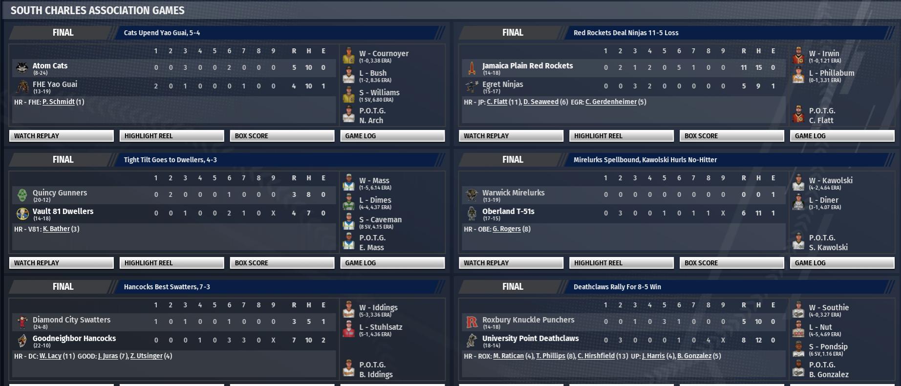 If people thought that Nordhagen Beach would easily take back control of the Brotherhood League, they were mistaken as the Ghouls continue to push success. With one 10-inning loss to a good team in Abernathy, The Slog went 4-1, including a sweep over defending NCA champions, the Easy Town Assaultrons who plummeted back to last after getting swept. All of the Ghouls' success comes from their bats, leading the NCA in runs (174), batting average (.294), and four other categories. SS Lernz Tentsleep has been on fire (.344/10/32) and 2B C.T. Woodard (.404/2/20) is among the best hitters in the CBO this season, currently leading the NCA in batting average and the CBO in stolen bases (15).
