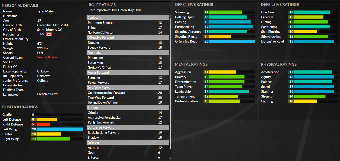 This was also an interesting season. This time without Stanley Cup. But Kraken were lucky to pick Nr. 1 in the 2063 draft. And our choice was young Canadian forward Tyler Mater. After his first NHL season he is already a 5-star player. But he plays Left Wing, where we have one of the best player in the league Tyler Radunske. And this guy did again a high-scoring season. Unfortunately, he was injured and therefore played only 65 games. But 46 goals and 81 points are very good numbers. If he played 82 games, he would be a top scorer. Our defensman Trevor Almond was best in +/- with +61. In regular season our team on top with 124 points and 59 wins. |