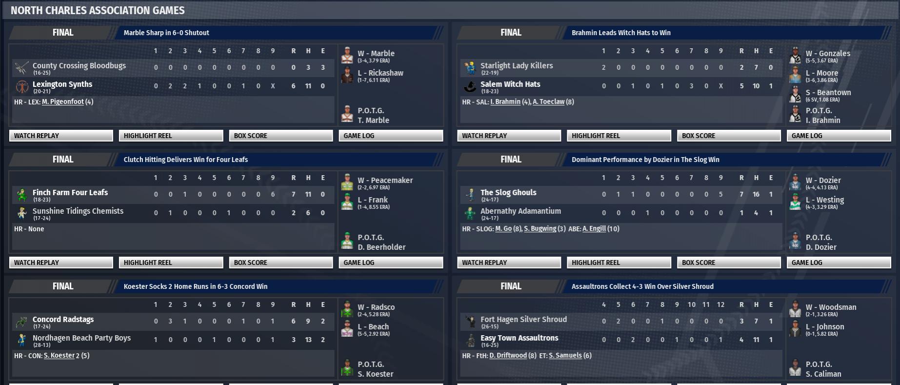 Today in the CBO News and Notes - Reports from around the Commonwealth by Nat Wright-Kawolski 30 May 2299 - Marble Sharp in 6-0 Shutout Tristan Marble of the Lexington Synths spun his magic on the County Crossing Bloodbugs today. He blanked them 6-0 on 3 hits, registering 7 strikeouts and 1 walk. "The bottom line was I just kept the ball down," Marble said. "My breaking stuff was down. Everything was down." Talking to reporters in the postgame interview, Lexington skipper Sprole Races said the team "got solid pitching, good defense and took great team at-bats in a lot of different situations." "Tristan pitched really well but this was a solid performance by everyone," he said. In 11 starts this season Marble has rung up a 3-4 record and a 3.79 ERA. 30 May 2299 - Koester Socks 2 Home Runs in 6-3 Concord Win The Concord Radstags downed the Nordhagen Beach Party Boys, 6-3. The hitting star was shortstop Sean Koester. Koester was 3 for 5 with 2 home runs and a double. He drove in 4 runs and scored twice for the Radstags. Concord goes to 17-24, Nordhagen Beach to 28-13. Koester contributed a big hit, a 3-run home run, for Concord in the top of the second. With his team trailing 1-0, Koester took a slider from Tommy Beach and stroked the home run to right. His 5th home run of the season allowed the Radstags to leap in front, 3-1. Koester called the triumph "a good team win." Tommy Beach (5-5) suffered the loss despite giving up only one earned run. The problem was Beach gave up a total of four runs thanks to errors by Dustin Mart and Mike Swift. 30 May 2299 - Brahmin Leads Witch Hats to Win The performance of Ian Brahmin proved critical in helping Salem beat Starlight, 5-2. The Witch Hats third baseman went 3 for 3 with a home run and 2 singles, while adding 4 RBI and scoring once. Dan Beantown, summoned from the bullpen, notched his 6th save. Salem is third in the North Charles Association Brotherhood League with a record of 18-23. Brahmin had a game-changing home run in the bottom of the seventh. On a 1-1 fastball from City Moore, he banged a 3-run home run to right, giving the Witch Hats a 5-2 lead. It was the 4th home run of the year for Brahmin. "We'll enjoy this win," said Brahmin. "But there's more we hope to accomplish." 30 May 2299 - Assaultrons Collect 4-3 Win Over Silver Shroud in 12 Easy Town Assaultrons starter Smoker Caliman was in a groove as he led his team to a win over the Fort Hagen Silver Shroud, 4-3. Fort Hagen has now lost 5 straight. The Assaultrons relied on right fielder Dan Squirrel for the game-winning hit. And, in the bottom of the 12th, he delivered, hitting a run-scoring single to seal the deal. Caliman called the extra-inning win a "confidence builder." 30 May 2299 - Swatters Top Mirelurks, 4-0, Behind Fusion The Diamond City Swatters picked up a win at The Great Green Jewel, knocking off the Warwick Mirelurks, 4-0. Starting pitcher Tim Fusion played a key role in the triumph. The win gives Diamond City a season record of 30-11. Fusion scattered 3 hits over 7.1 innings for the Swatters. With the win, Fusion moves to 7-2 on the year with 72 strikeouts. "I tried to mix it up, keep them off balance," said Fusion.