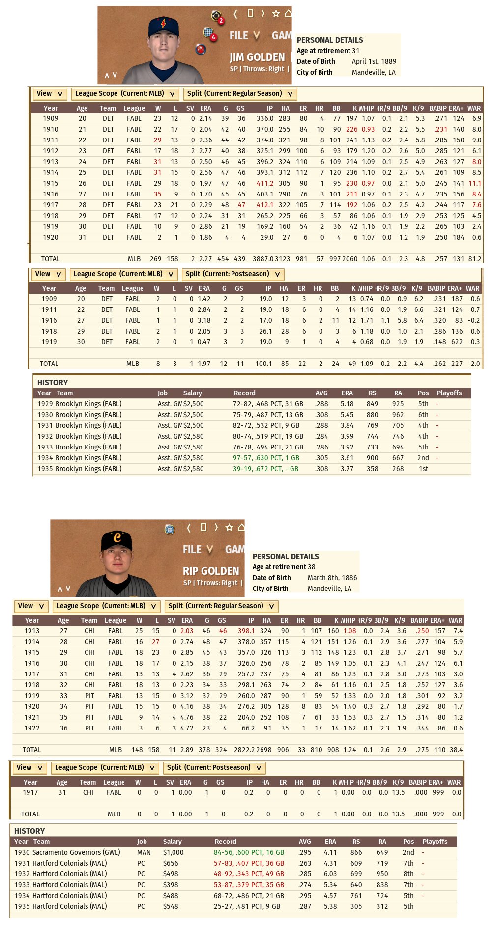 FABL BIO OF THE DAY THE GOLDEN ARMS OF MANDEVILLE, LOUISIANA Tiny Mandeville, Louisiana was best known as being a resort hangout for the New Orleans middle class since it's creation in the mid 1800s. While today Mandeville boasts a population of over 12,000 in 1900 there were barely 1,000 residents but two of them would go on to become pretty good FABL pitchers. Jim (1909-20) and Rip (1913-22) Golden combined for 417 FABL victories, 5 World Championship rings and 2 Whitney Awards of the course of their careers. Each began playing semi-pro ball for local teams in nearby Hammond, Louisiana before being discovered by FABL scouts. The call came for Jim first, despite the fact he was 4 years younger than Rip, as the Detroit Dynamos signed him after witnessing him pitching for Hammond against a New Orleans club in 1908. He would go directly from the semi-pro circuit to the big leagues and did so with a bang. Rip, meanwhile, had been nursing a broken leg suffered that spring while working on the steamships that ferryed back and forth across Lake Pontchartrain between New Orleans and Mandeville, so he did not catch the attention of Detroit scouts. In fact it would not be until 1912 when Rip was finally signed by the Chicago Chiefs as a 26 year old and his big league debut would come the following season. In Rip's final year with Hammond ballclub he showed some of the skills that would later lead him to becoming a pitching coach as he mentored a then 16 year old Johnny Taylor before Taylor went on to pitch for St Blane University and spend 5 years in the big leagues himself. By 1913 when Rip was preparing for his big league debut in Chicago, younger brother Jim was already a FABL veteran. Jim took the Federal Association by storm in 1909 when as a mere 20 year old he would win 23 games and then add two more victories in the World Championship Series to lead Detroit past Toronto for it's first of 5 FABL titles for the franchise. Jim was named the Most Valuable Player of the 1909 series and would play a key role for 4 more pennant winning Detroit squads, finishied with an 8-3 career postseason record to go with a 1.97 era and 4 World Championship rings. He would follow up his rookie season with two more twenty win campaigns including a league best 29-13 in 1911 but he was just getting started. 1913, the year Rip debuted in Chicago, Jim was named the Whitney Award winner as Most Valuable Player of the Federal Association after posting a league best 31 victories. Jim would win a second Whitney Award in 1916, when he went 35-9 and led Detroit to the first of three World Championships in a four year span. Only Mike Marner, with 36 for Baltimore in 1908, won more games in a single season since the turn of the century than Jim Golden's total that year. Jim Golden remains to this day the all-time leader in career World Championship games won and only Woody Trease has pitched in more than the 100 World Championship Series innings that Golden has tossed. Code: