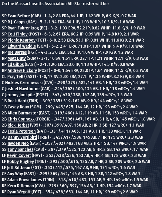 Today in the CBO News and Notes - Reports from around the Commonwealth by Nat Wright-Kawolski 29 June 2299 - BMU: All-Star Game Rosters Announced The All-Stars are in a class by themselves. The star performers from the Commonwealth Association and Massachusetts Association will soon do battle in the 2299 Boston Minor Union All-Star Game. It's an annual diamond spectacular that takes place after the midpoint of the season. Two superb ballclubs taking each other on in the All-Star Classic to determine the best league for this year. The talented stars are playing for league pride and to show off their abilities to the CBO clubs. Each roster is filled with standout performers.