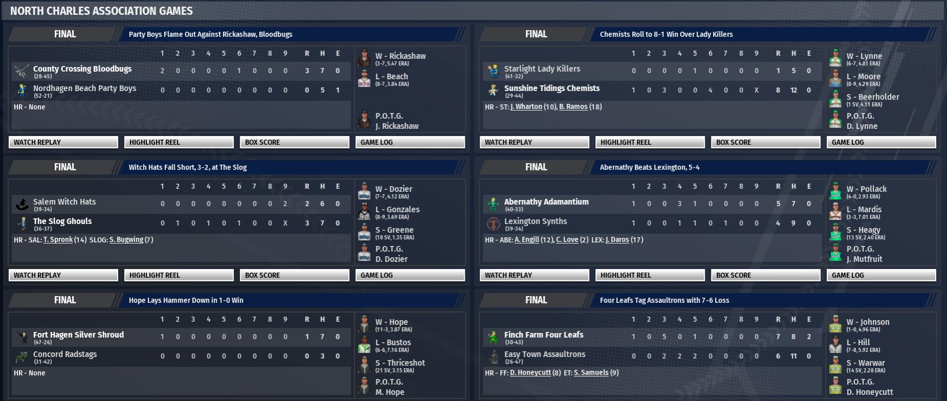 Today in the CBO News and Notes - Reports from around the Commonwealth by Nat Wright-Kawolski 21 July 2299 - County Crossing Roughed Up By Party Boys' O The Nordhagen Beach Party Boys easily defeated the County Crossing Bloodbugs, 12-3, at Beantown Brewery Stadium, with first baseman Dustin Mart a main contributor to the win. He slugged 2 home runs, while scoring 3 runs and driving in 6 for Nordhagen Beach. Pop Murphy, not ready to give up his spot to the returning Ryan Combs, was 3 for 5 with a double, two home runs, three runs, and six RBI. Nordhagen Beach has an impressive 54-22 record, tops in the CBO. Mart had a key at-bat for Nordhagen Beach early in the game. With runners on 1st and 2nd, he hit a 3-run home run. It was his 16th home run of the season and gave Nordhagen Beach an early 3-0 lead. "We did a lot of things right," said Mart. Derek Gist picked up his 10th win to move to 10-4 on the season. In 6.0 innings, he allowed three earned runs on seven hits with three walks and four strikeouts. He allowed homers to Mush Levy (12) and Taygun Topaloglu (6) in his final inning pitched. 21 July 2299 - Deathclaws Take It on Chin, Lose, 11-0, to Goodneighbor Matt Pageturner was in a mood to talk following the Goodneighbor Hancocks contest against the University Point Deathclaws, expounding to BNN reporters on his pitching philosophy. He had good reason to be excitable, having tossed a complete-game shutout of the Deathclaws, 11-0. "There are three important elements in pitching success: location, location, and location," Pageturner said. "I was hitting my spots time and time again." The right-hander blanked University Point on a 5-hitter, allowing 3 walks and racking up 4 strikeouts. In 20 starts this season Pageturner has compiled a 14-2 record and a 3.39 ERA. With Goodneighbor, he is 7-0 with a 2.96 ERA. The Hancocks offense was also firing on all thrusters, with Bryan Assman going 3 for 5 with two home runs (22 + 23) with two runs and three RBI. Jason Juras also hit two home runs (19 + 20), going 2 for 4 with a walk, three runs, and five RBI. Burtie Cuttooth also added his 12th home run of the season. Assman and Juras represent the only teammates in the CBO currently with 20+ home runs. Finch Farm is the only other team on the brink with two players at 19 homers each. 21 July 2299 - Adamantium Take Down Synths, 5-4, in 10 The Abernathy Adamantium racked up a win at Tato Field, bumping off the Lexington Synths, 5-4, in 10 innings. Kyle Clevinger, who started for Abernathy, pitched effectively for his team. Abernathy has run its win streak to 4 in a row. The Adamantium procured the win, in large part because of pinch hitter Lucky Libow. In the bottom of the tenth, he produced the game-winning run-scoring single. Libow said afterward that he was "glad the fans were treated to a good ballgame." Joel Mutfruit, third baseman for the Abernathy Adamantium, ran his consecutive-game hitting streak to 20 games with 1 hit in his club's victory today. "Not the outcome we wanted," Lexington manager Sprole Races said. "There's never a good time to lose, and it's never fun to be on the wrong end of somebody else's accomplishment." Mutfruit flied out in the 1st, walked in the 4th, singled in the 6th, struck out in the 7th, and flied out in the 9th. So far this season Mutfruit has hit .286 with 7 home runs, 45 RBIs, and scored 43 times. 21 July 2299 - Chemists Curb Silver Shroud, 2-1 Sunshine Tidings starter Bill Sarnacki pitched well against the Fort Hagen Silver Shroud at Hubris Comics Park. The left-hander led his team to a win, 2-1. Vince Moon converted his 5th save in 6 tries. The Chemists sport a record of 31-45. The Chemists got an important contribution from center fielder Frank Corsica, who in the top of the third knocked a 2-1 fastball into left-center for a run-scoring double. It was his 30th double of the season and put the Chemists ahead, 2-0. "Winning never gets dull," said Corsica. Sarnacki (5-11) pitched one of his better games of the season, holding the Shroud to just one earned run on seven hits with two walks and four strikeouts in 8.0 innings. His best game came June 2 against Abernathy when he held the Adamantium to just one run while striking out 11 in 8.1 innings. 21 July 2299 - Swatters Lose Late, 7-3 The Oberland T-51s topped the Diamond City Swatters by the score of 7-3, with the largest share of the credit going to second baseman Jonathan Abern. Abern went 2 for 4 with a triple. He scored 2 times and drove in 3 for the T-51s. Matt Udder, the winner, improved to 10-7. He held Diamond City to 3 runs on 6 hits over 7 innings, while racking up 6 strikeouts. The victory gives Oberland a record of 40-36, 12 games back of the Swatters. Abern came through with some timely hitting for Oberland. With Diamond City trailing 3-2 in the top of the eighth, Abern hit a full-count curveball for a bases-clearing triple. His 13th triple of the season made it 5-3, Oberland. "When this team comes together and plays the way we can, we can compete with anyone," said Abern. "I think we're going to keep proving that."