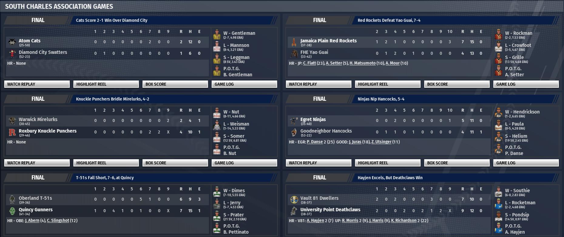 Today in the CBO News and Notes - Reports from around the Commonwealth by Nat Wright-Kawolski 18 July 2299 - Fusion Now 11-4 After Subduing Cats Tim Fusion never let the Cats get in a groove. The left-hander used his bread and butter, his changeup, to pitch the Swatters to a win, 4-0. With the win, Diamond City raised its record to 52-22. Fusion tossed 116 pitches over 8.1 innings to clinch the win for the Swatters. The left-hander allowed just 3 hits, while racking up 9 strikeouts in the game. Fusion said his team "played with determination." Sensation Oren Gep was 3 for 4 with a home run (16), a run, and two RBI. Nick Minnier and Tyler Ross also homered. Swatters 2B Danny Suarez had to leave the game in the 1st inning when Jake Doucette of Atom collided with Suarez and poked him in the eye. Mike Grognak finished the game at 2B. 18 July 2299 - Silver Shroud Prevail, 7-5, Over Finch Farm The Fort Hagen Silver Shroud picked up a win at Hubris Comics Park, knocking off the Finch Farm Four Leafs, 7-5. Starting pitcher Mike Cartrette was a big reason why. In 6.2 innings, Cartrette surrendered 2 hits, while striking out 14 and walking 2. He allowed 2 runs. Curtis Thriceshot was credited with the save. He has now successfully converted 22 of 25 save opportunities. In the bottom of the first, Andrew Nuka hit a 3-run home run. The 17th home run of the season for the Fort Hagen left fielder put the Silver Shroud on top, 3-0. "You know, at the end of the day, it's about who scores the most runs," said Fort Hagen manager Mark Andersen. Shroud reliever Bob Kearns had a tough stretch in relief, making a game well in hand close. Kearns allowed three earned runs on three hits with a walk and three strikeouts in 1.0 innings in relief to push his ERA up to 15.26. Matt Demented was able to help the Shroud escape the three-run 8th for Finch Farm before Thriceshot came on to pitch the 9th inning. The North Charles Association Institute League-leading Silver Shroud are 48-26. 18 July 2299 - Nordhagen Beach Wins, 7-6, in Extra Innings The Nordhagen Beach Party Boys beat the Lexington Synths, 7-6, in 10 innings at Slocum's Joe Seaside Stadium. The Party Boys got a fine performance from right fielder Jonathan Angelou, who went 2 for 3 with a home run, a double, and 2 walks, while scoring 3 times. The win belongs to Sia Abber in relief. His record improves to 8-0. Doug Dee El (2-4) took the loss for Lexington. Nordhagen Beach raised its record to 53-21 with the win. The Party Boys procured the win, in large part because of shortstop Ryan Bale. In the bottom of the tenth, he produced the game-winning run-scoring triple. "This place went bonkers at the end," Angelou said. Dustin Mart also contributed to the Boys' success, going 2 for 5 with a home run (13), two runs, and three RBI. Crooked Tostado led the Synths by going 3 for 5 with a team-tying three doubles and four RBI. Mike Pigeonfoot went 3 for 6 with a double, three runs, and an RBI. 18 July 2299 - Gunners Top Oberland, 2-1 Gunners fans were sent into a frenzy with a walk-off win. Oberland wasted a solid 8.1-inning effort from starting pitcher Sheng Kawolski, losing to Quincy, 2-1, at The Stone House. The winner was Quincy reliever Ryan Kazarian, now 4-1. The loser was Sheng Kawolski (11-5). In the bottom of the ninth, Quincy's Bryan Benton led off the inning with a solo home run to tie the game, 1-1. With one out, star Ben Pettinato doubled. Stuart Costantino was the walk-off hero, hitting a dramatic run-scoring single to send the teams home. Costantino attributed the win to "energy and focus on the part of everyone." The win gives Quincy a season record of 40-34, now three games up on University Point for the Minutemen League wildcard spot. The T-51s have now lost three straight, giving them just a one-game lead over Vault 81 for the Railroad League wildcard spot.